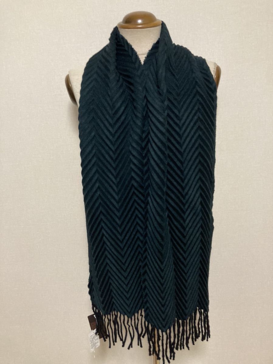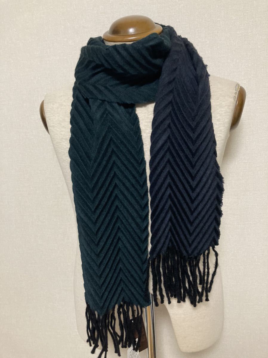 新品 アルテ(伊) ホワイトカシミア100% 極上プリーツマフラー 濃紺×深緑 リバーシブル ユニセックスで 定価3.5万円
