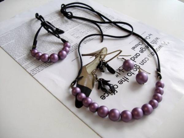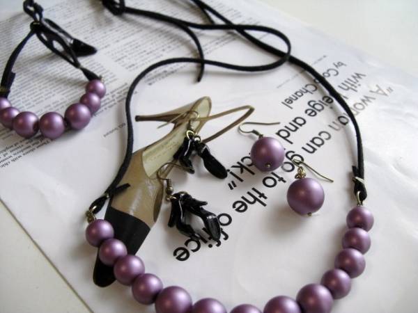 モードな秋色・・シリーズです♪大人色のパール・・シックなダークパープルの樹脂パールのネックレス、ブレスレット、ピアスの3点セットです♪ピアスはデザイン違いの2組です♪マットな深いパープルのパールに黒のスェード紐を合わせて甘すぎない大人のロマンチックしています♪ネックレスは8ミリと10ミリのパールです♪長さは全長105センチ位です♪短く結んでチョーカー風にされても素敵です♪ブレスレットは8ミリ、10ミリのパールです♪長さは全長27センチ位で調節自由です♪樹脂パールのピアスは12ミリの丸玉です♪長さは3・5センチ位です♪黒のヒールのピアスは4・5センチ位です♪イヤリングにも変更出来ます♪それぞれ単品も出品しています♪ハンドメイドをご理解いただいてノークレーム・ノーリターンでお願いします♪
