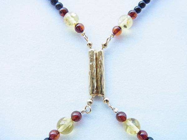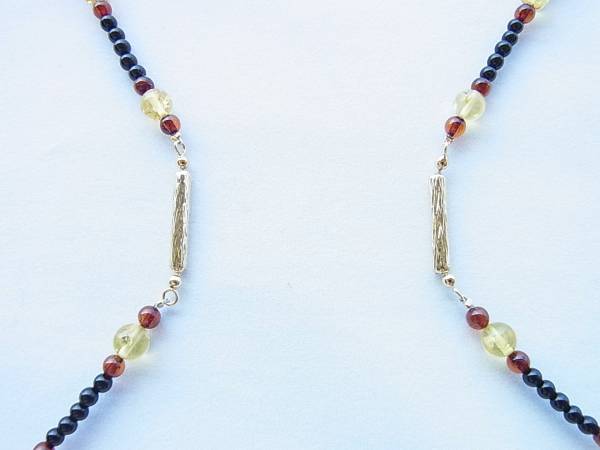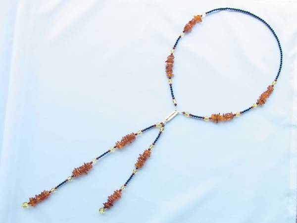 【数量限定販売になります】 天然琥珀とブラック・カルセドニーを組み合わせたネックレスです。 重量が軽いのも琥珀の魅力の一つです。 脱着が簡単なマグネットタイプの留め金を使用しています。 琥珀は、模造品や再生琥珀等の天然琥珀ではない琥珀が多く出回っていますが、鑑別機関の最高峰 「中央宝石研究所」 で鑑別をして、間違いない商品を供給してくれる、信用できるサプライヤーから仕入れをしています。 近年、産出量が激減し、値段が高騰しております。また産出国の輸出規制等によって、日本への輸入量も激減しています。 使用石 : 天然琥珀 天然ブラック・カルセドニー(処理石) 全長 : 約95cm 最大幅 : 約13mm 形状が不定形の為、目安になります。 留め金 : マグネット式 地金 : シルバー メッキ : ゴールド・コーティング 天然琥珀特有のグリッターと呼ばれるクラックやインクルージョンがあります。 グリッターは、個体差があります。 | ||||