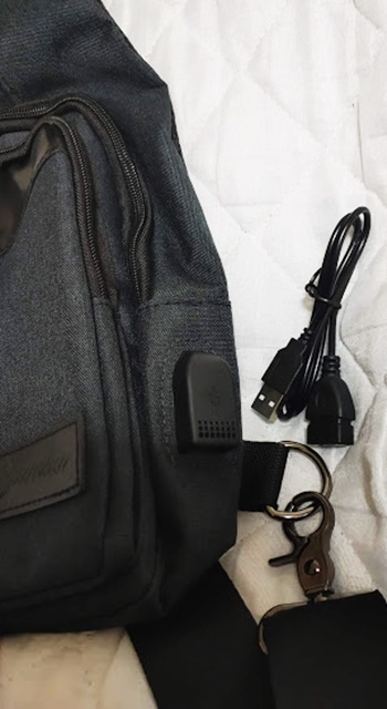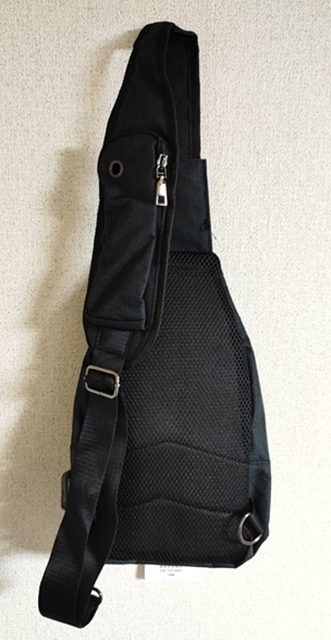 ショルダーベルト部分に小さいファスナーポケットがあり、イヤホン穴があります。