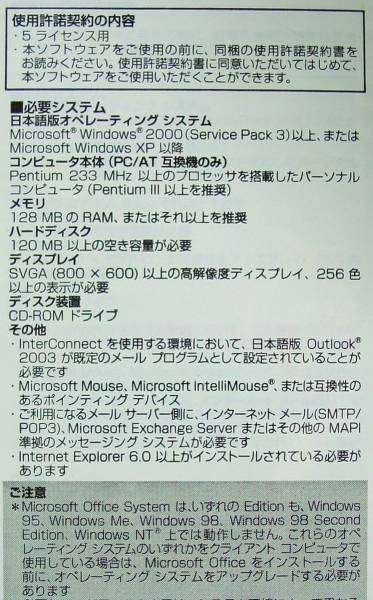 マイクロソフト オフィス InterConnect 2004 5ライセンス版(スマートビジネスパック ユーザー限定)の新品未開封品です。詳細画像
