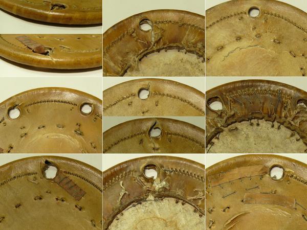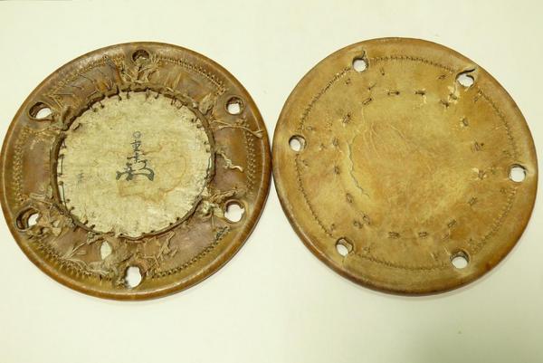 写真左>直径23cm、写真のように針金やテープなどで補修の跡があります。その他紐の穴にひび割れ等あります。右>直径22.8cm。写真のようにヒビがあり、その他紐の穴にひび割れ等あります。 その他古いもので、経年の擦れ、汚れ、傷等ございます。状態は写真をご参照頂けますようどうぞよろしくお願いいたします。