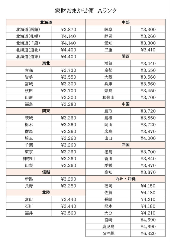 配送方法は「家財おまかせ便」もしくは「直接引取」となります。 1.「家財おまかせ便」 送料は落札者様のご負担とさせて頂きます。 送料は地域別で異なります。下の表にてご確認をお願いいたします。