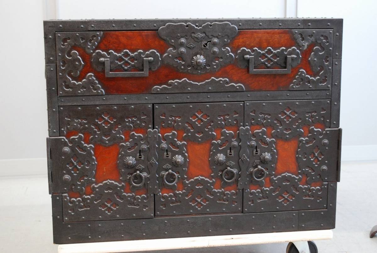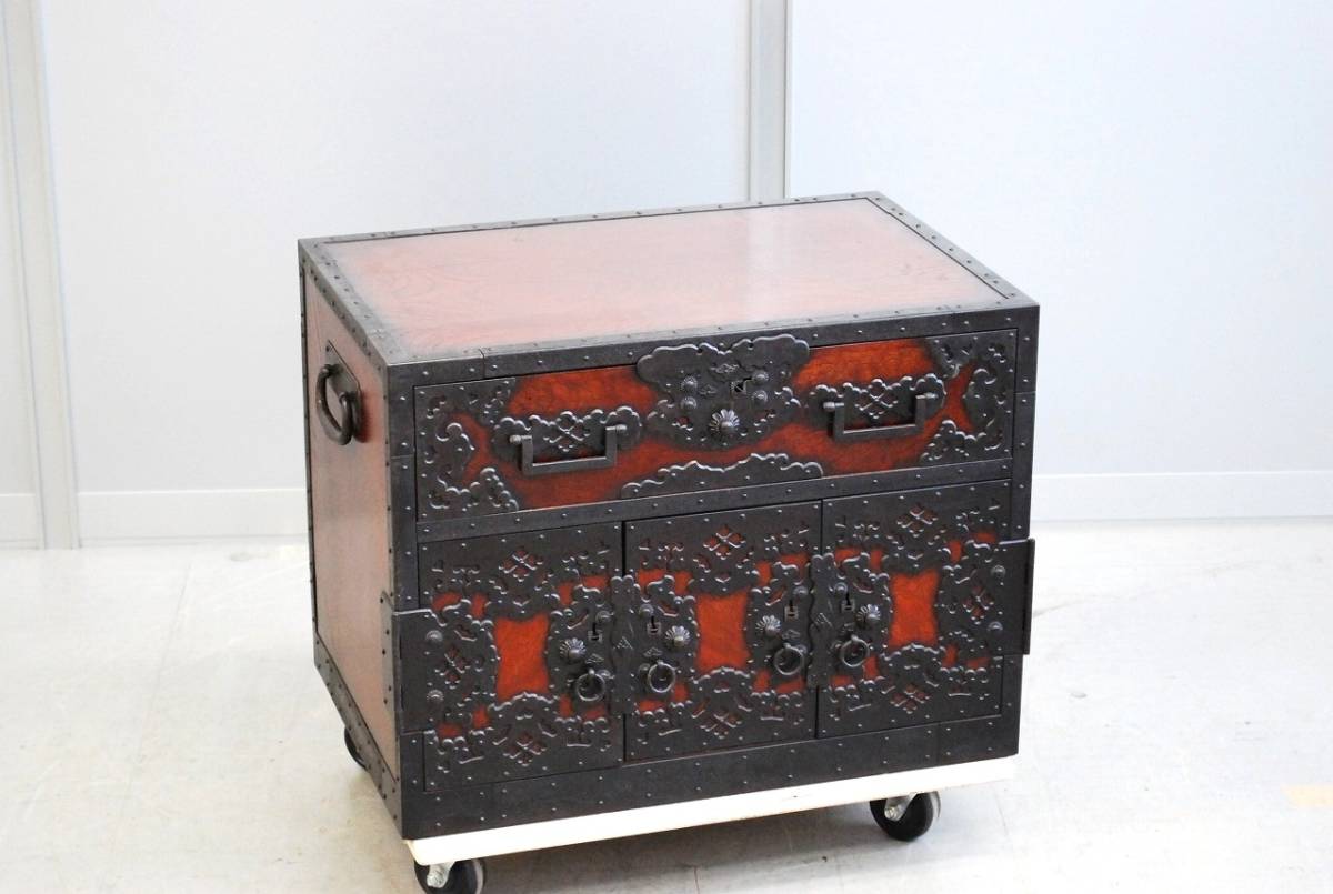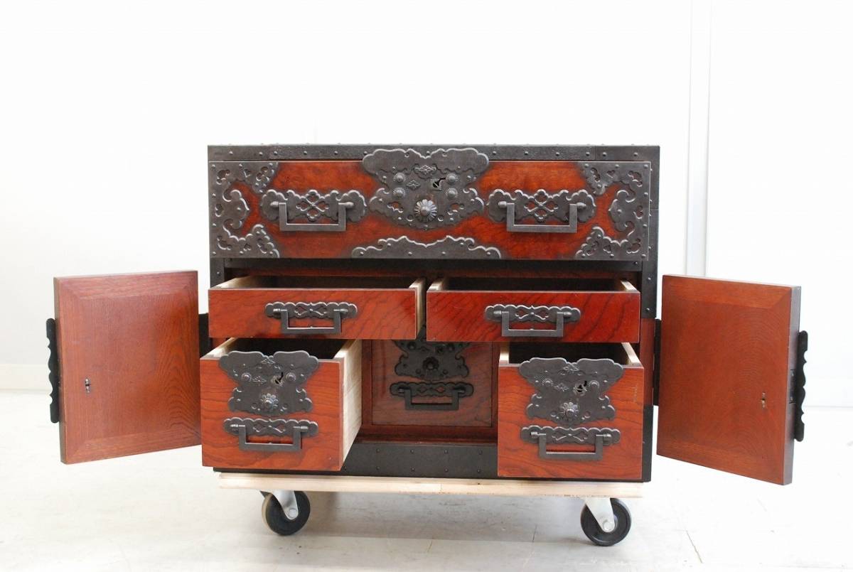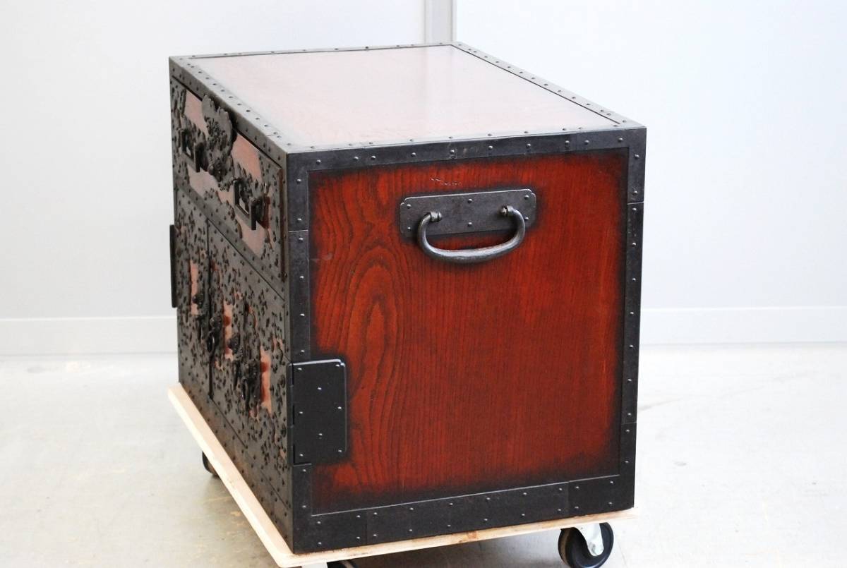 大変貴重な逸品、船箪笥 (帳箱) のご紹介です。 産地は新潟県佐渡地方。 江戸末期から明治時代につくられた逸品です。 年代を考慮すると非常に状態の良い美品と言えます。 船箪笥は江戸時代に商船で貴重品入れとして使用されていた箪笥です。 非常に頑丈に作られており、盗難防止のための様々な工夫がなされています。 こちらの船箪笥の本体は欅の無垢材でつくられており、分厚い金具で補強を兼ねた装飾が施されています。 底の部分は格子が組まれており、非常に堅牢なつくりをしています。 総重量はおよそ36kg。 非常に頑丈で重厚なつくりです。 上の段には引き出しが1杯。 内部は桐の無垢材でつくられており、引き出しの内寸は幅556mm×奥行375mm×深さ123mm程度です。 下の段は左右が片開きの戸になっており、中央の一枚は左、もしくは右にスライドして取り外す戸になっております。 戸を開けると引き出しが合計5杯に見えますが、中央下の前板はけんどん式です。 けんどん式の前板を取り外すと、中には鍵付きの隠し箱がございます。 こちらの前板もけんどん式で、中にはさらに桐の箱が収納されております。 こちらの桐箱の内寸は、幅118mm×奥行287mm×深さ85mm程度です。 上記の箇所の周囲の4杯は、通常の引き出しとなっております。 上の薄型の引き出し2杯は、幅247mm×奥行333mm×深さ58mm程度。 下段左右の鍵付きの引き出しの内寸は、幅152mm×奥行333mm×深さ132mm程度となっております。 こちらの船箪笥には鍵が4本付属いたします。 4本それぞれ先端の形状が違い、使用する箇所が違います。 ※施錠する際は鍵は不要で、金具の一部をスライドさせることにより、施錠が可能です。そのため、鍵を内部に入れたまま施錠してしまうと開けられなくなってしまいますので、くれぐれもご注意ください。 これほどに状態の良い船箪笥に出会う機会は、そうそうございません。 非常に貴重な逸品です。 この機会に是非。 こちらの商品は中古品です。 当方でクリーニング、引き出しの調整等のメンテナンスをしておりますが、経年・使用による細かいキズや汚れなどがございます。また、背板、側板に割れが見られます。 商品の詳細な状態は、写真の枚数の都合上下記リンク先に動画をUPしております。 入札前に、必ずご確認をお願いいたします。 ※商品の詳細な状態はこちらをクリックしてご確認ください①。 ※商品の詳細な状態はこちらをクリックしてご確認ください②。 ご不明な点がございましたら、質問欄よりお気軽にお問い合わせください。 |