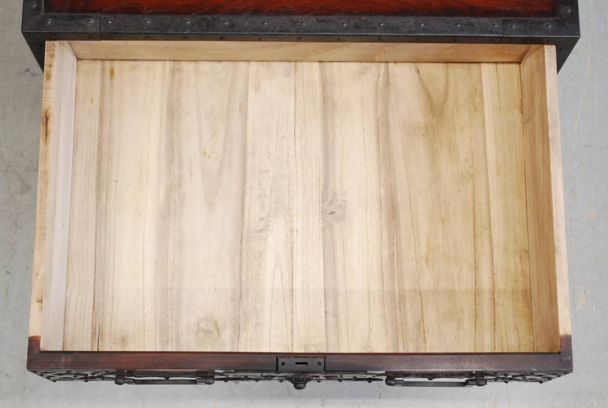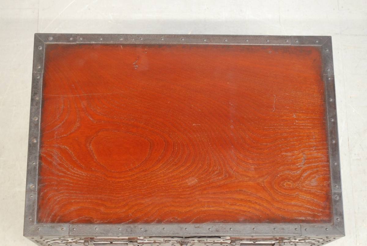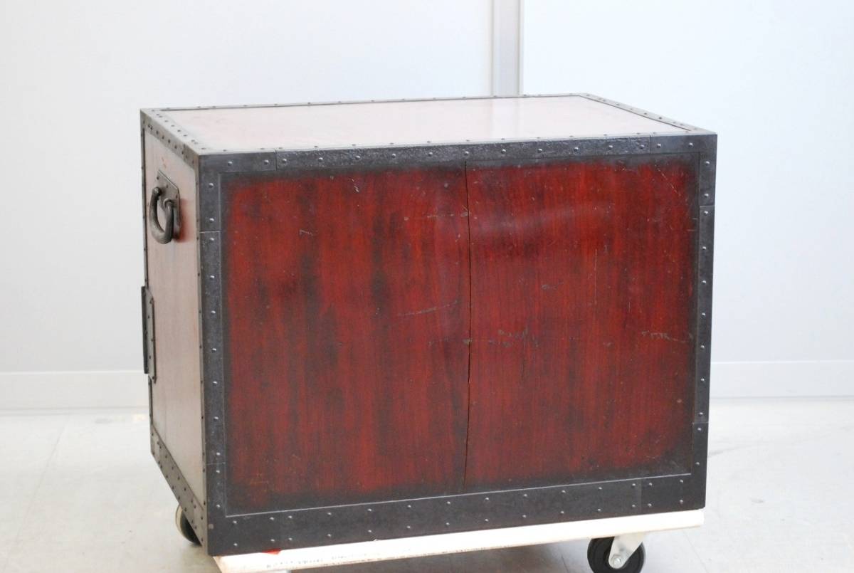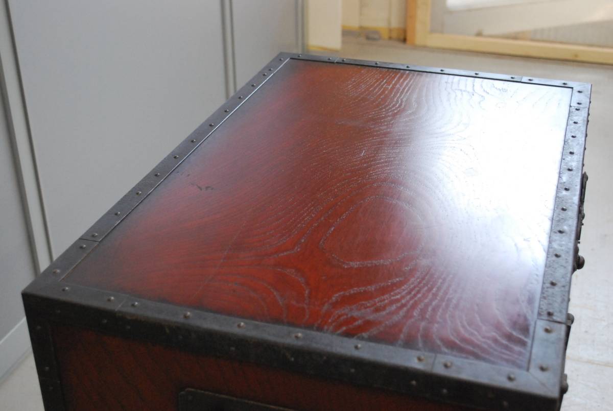 大変貴重な逸品、船箪笥 (帳箱) のご紹介です。 産地は新潟県佐渡地方。 江戸末期から明治時代につくられた逸品です。 年代を考慮すると非常に状態の良い美品と言えます。 船箪笥は江戸時代に商船で貴重品入れとして使用されていた箪笥です。 非常に頑丈に作られており、盗難防止のための様々な工夫がなされています。 こちらの船箪笥の本体は欅の無垢材でつくられており、分厚い金具で補強を兼ねた装飾が施されています。 底の部分は格子が組まれており、非常に堅牢なつくりをしています。 総重量はおよそ36kg。 非常に頑丈で重厚なつくりです。 上の段には引き出しが1杯。 内部は桐の無垢材でつくられており、引き出しの内寸は幅556mm×奥行375mm×深さ123mm程度です。 下の段は左右が片開きの戸になっており、中央の一枚は左、もしくは右にスライドして取り外す戸になっております。 戸を開けると引き出しが合計5杯に見えますが、中央下の前板はけんどん式です。 けんどん式の前板を取り外すと、中には鍵付きの隠し箱がございます。 こちらの前板もけんどん式で、中にはさらに桐の箱が収納されております。 こちらの桐箱の内寸は、幅118mm×奥行287mm×深さ85mm程度です。 上記の箇所の周囲の4杯は、通常の引き出しとなっております。 上の薄型の引き出し2杯は、幅247mm×奥行333mm×深さ58mm程度。 下段左右の鍵付きの引き出しの内寸は、幅152mm×奥行333mm×深さ132mm程度となっております。 こちらの船箪笥には鍵が4本付属いたします。 4本それぞれ先端の形状が違い、使用する箇所が違います。 ※施錠する際は鍵は不要で、金具の一部をスライドさせることにより、施錠が可能です。そのため、鍵を内部に入れたまま施錠してしまうと開けられなくなってしまいますので、くれぐれもご注意ください。 これほどに状態の良い船箪笥に出会う機会は、そうそうございません。 非常に貴重な逸品です。 この機会に是非。 こちらの商品は中古品です。 当方でクリーニング、引き出しの調整等のメンテナンスをしておりますが、経年・使用による細かいキズや汚れなどがございます。また、背板、側板に割れが見られます。 商品の詳細な状態は、写真の枚数の都合上下記リンク先に動画をUPしております。 入札前に、必ずご確認をお願いいたします。 ※商品の詳細な状態はこちらをクリックしてご確認ください①。 ※商品の詳細な状態はこちらをクリックしてご確認ください②。 ご不明な点がございましたら、質問欄よりお気軽にお問い合わせください。 |