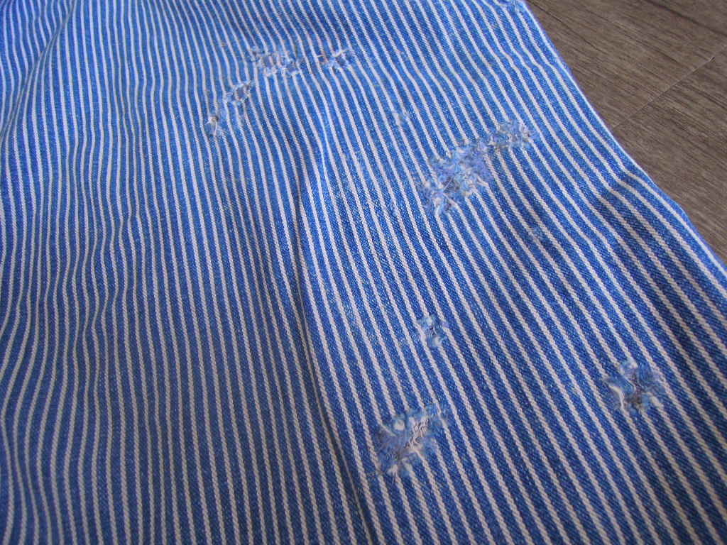 USED品で、太腿、膝にリペアや全体に着用に伴う小穴、擦れ、小傷、汚れ、ステッチ切れのある箇所などあります。( 該当画像参照)着用に支障となるダメージ等ありません。全体的に経年した質感と汚れがありますが、現状にご理解いただければまだまだ着用していただけると思います。