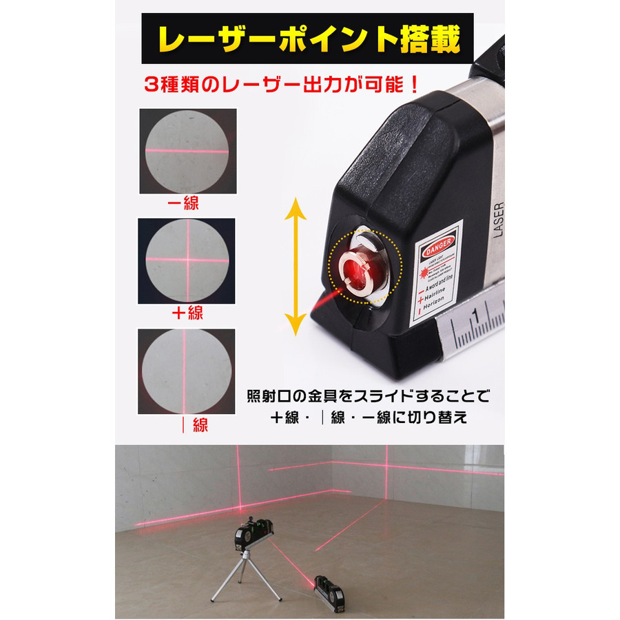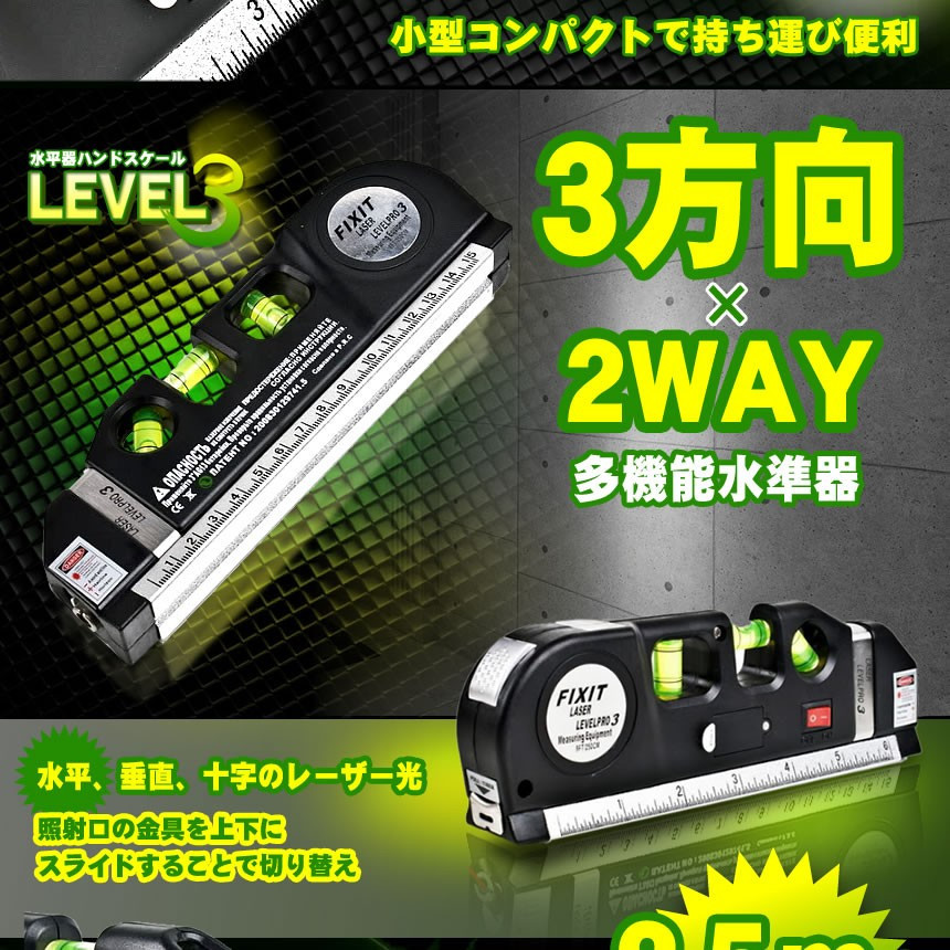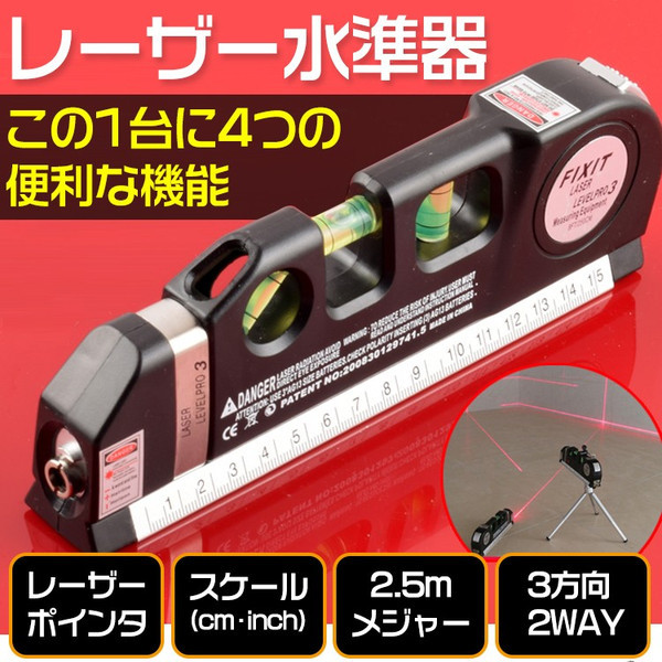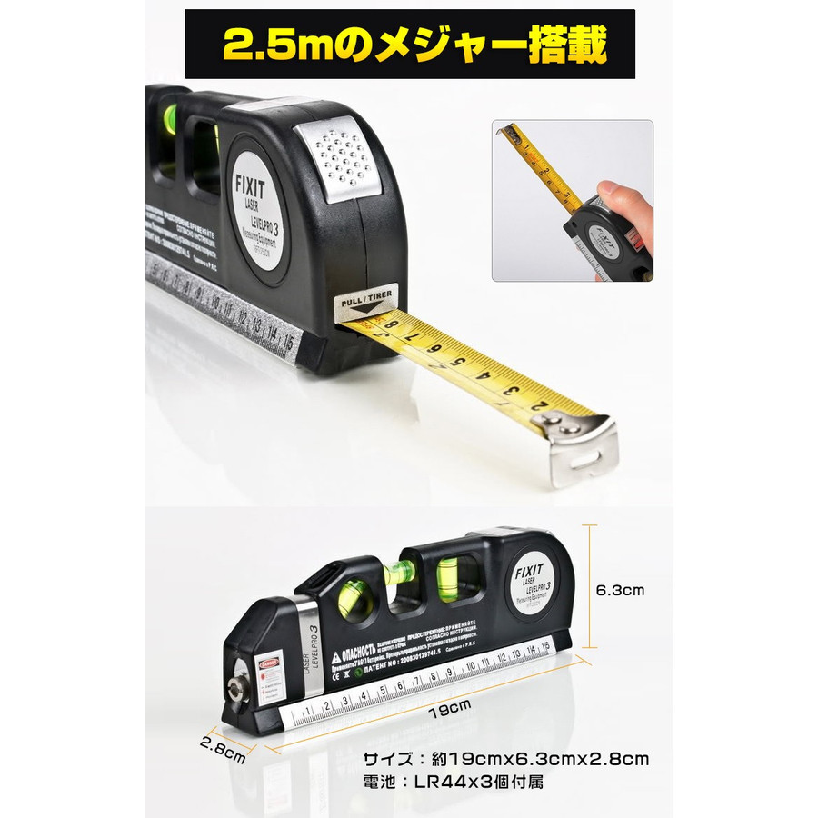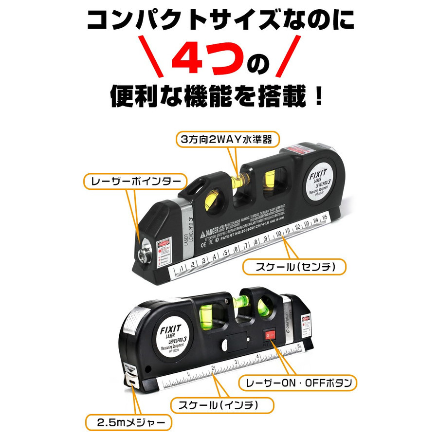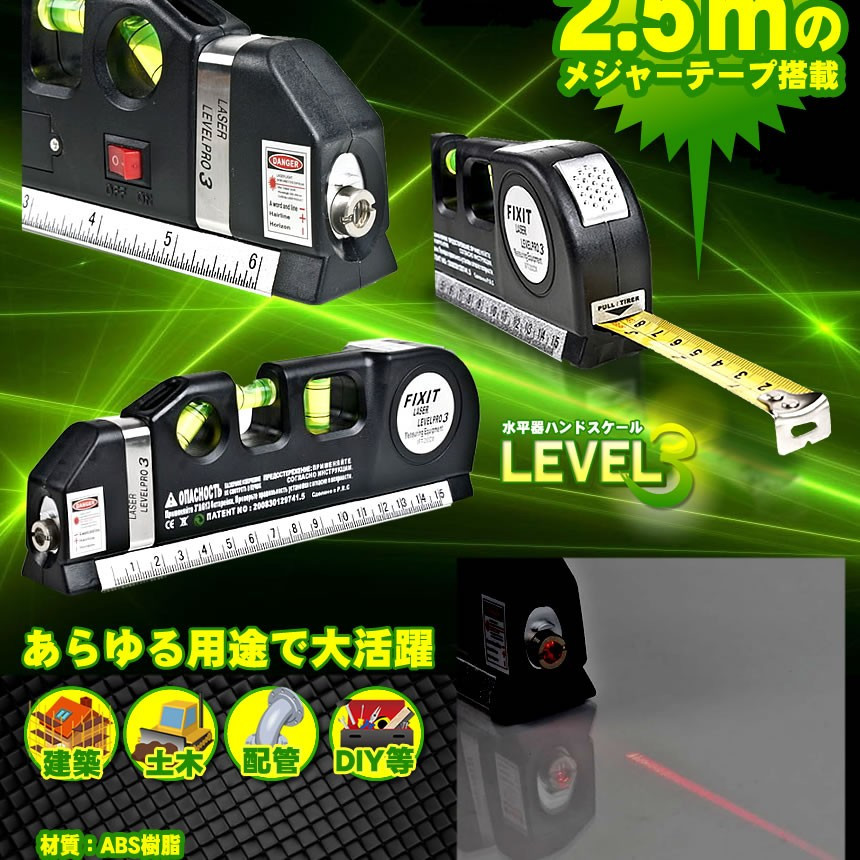 | 商品説明 | ■DIYの必需品!水平・垂直が一目でわかり、線も引きやすくとっても便利! ■レーザーポインタ搭載でさらに使いやすく! ■DIY以外にも絵やインテリアの調整にもオススメです! ■コンパクトサイズなのに4つの便利な機能を搭載! 建築、土木、配管、DIY等の作業に! 小型コンパクトで持ち運び便利なレーザーポインター付 2.5mメジャーテープ 水平、垂直、十字のレーザー光 (照射口の金具を上下にスライドすることで切り替え) 3方向2WAY水準器 【商品内容】:レーザー水準器 【サイズ】:約19x6.3x2.8cm 【重量】:約240g 【電池】:LR44x3個 |