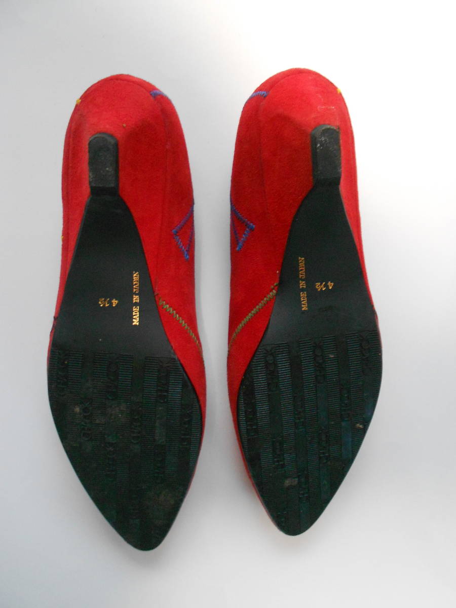 バックスキンのような生地にカラフルな刺繍が施された低ヒールのパンプス、22,5cmです。1度履いただけですのできれいです。気に入って買ったのですが、小さくてもう履くことができません。カラータイツなど合わせていただけるとおしゃれな着こなしができると思います。送料は簡易包装で定形外郵便660円です。