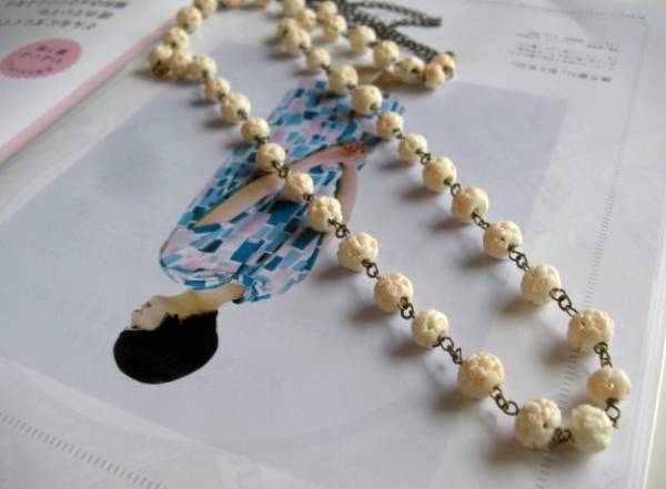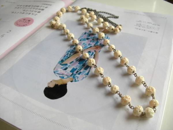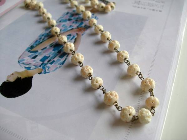 儚さを重ねて・・シリーズです♪ナチュラル気分・・ふんわりやさしいオフベージュの彫りボーンのネックレスです♪10×8ミリ位の彫りボーンが可憐な表情です♪長さは全長100センチ位で調節自由です♪2連にされても素敵です♪お揃いのブレスレットも出品しています♪♪シンプルで飽きのこないいつまでも着けられるデザインを考えて作りました!ハンドメイドをご理解頂いてノークレーム、ノーリターンでお願いします