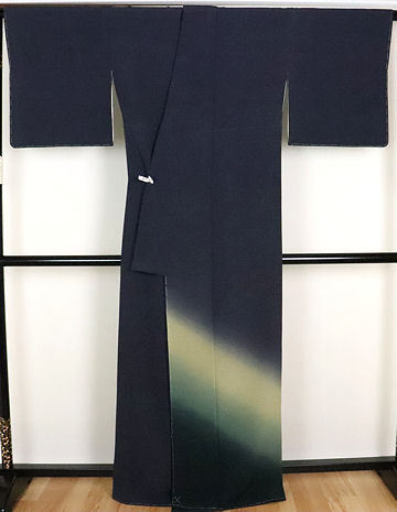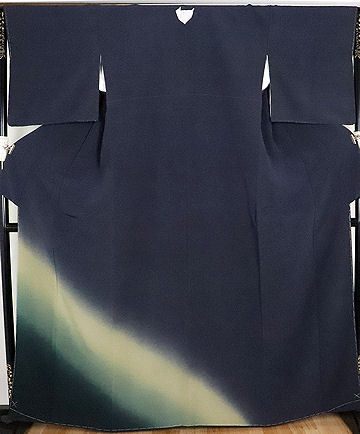 色留袖・訪問着 袷 丹後縮緬地 しけ引き地 紺小縞地模様地黄緑・薄緑・緑ぼかし 173 広襟 13号 一つ紋 新品 仕付け付き |