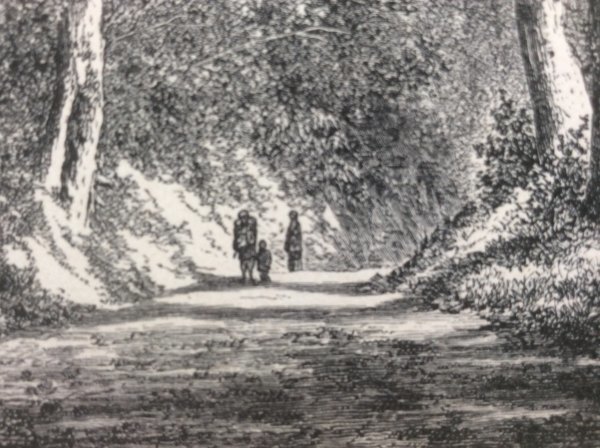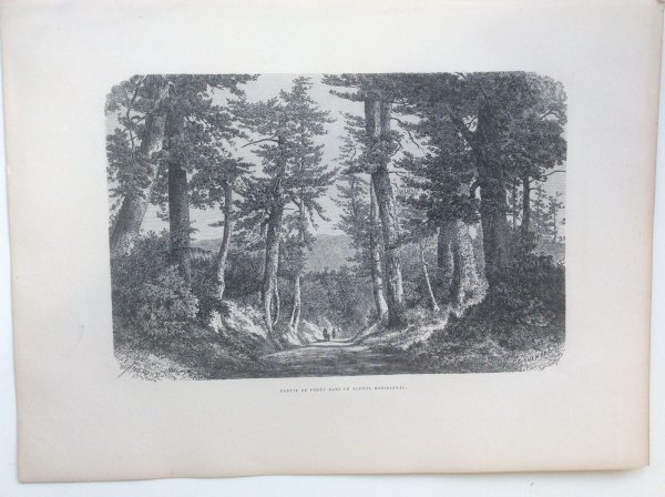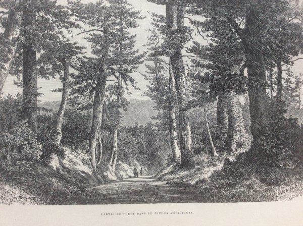 幕末1863年に、来日し、日本滞在中、当時の日本の風景や風俗習慣を記録し、帰国後1870年にパリのアシェット社から出版された稀覯本 幕末日本絵図に収められた木版画です。この版画は日本の南部の小道と題されていますが、幕末日本図絵を読むと当時nihonは、本州のみを指しており、京都 大阪より南の南紀地方の宗教的且つ精神的な役割を説明する中に出てくることから、南紀地方、特に熊野古道を描いたものと思われます。