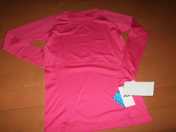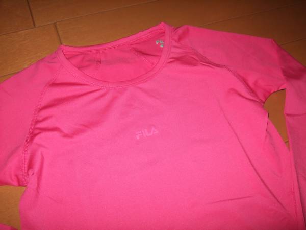 フィラの高機能素材のスポーツ用トップス、サイズMです。鮮やかなピンクで長袖なので、日焼けなどの防止にもなります。ポリエステル88.ポリウレタン12です。身幅約37、丈約58、即決です。ぜひご検討ください。