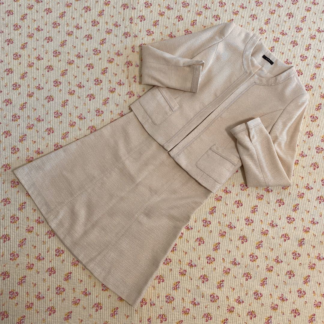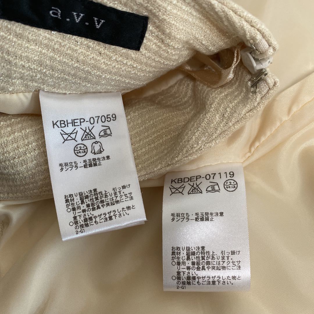ご覧いただきありがとうございます。染み、汚れ、ほつれのない、【新品同様】の、自信を持ってお勧めできる、良いお品を提供致しております。【極美】アーヴェヴェ スカートスーツ S W66 ベージュ ラメ 未使用に近い DMW でございます。アーヴェヴェa.v.v の【新品】セットアップをお買い上げ予定の方にお勧めできる、上質素材のスーツです。季節感は春秋冬に活用できると思います。上品で、清楚な雰囲気で着こなせます。面接、ビジネス、学校行事にお勧めです。お色は画像でご確認下さい。画像に良くお色が出ています。ベージュラメです。総裏仕立て。フロントにホックが5つ付いています。袖口は、折り返して着ることもできるタイプです。ノーカラージャケット、外ポケット×2。内ポケット×0。スカート、左サイドファスナー、ポケット×0。スリットなし。脇染み、汚れ、ほつれのない【極美】、とてもきれいなスカートスーツです。 ほぼ【新品/未使用】品に近い、とてもきれいなセレモニースーツです。サイズの合う方に、是非お勧めします。ノーカラージャケット。