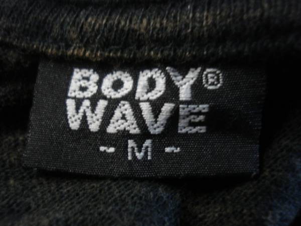 格安廃版レアかっこいい・BODYWAVE(ボディウェーブ)・黒系ボーダー風斑染地・GOODLUCK NEW YORKプリント入り・高級半袖丸首系Tシャツ Mになります。