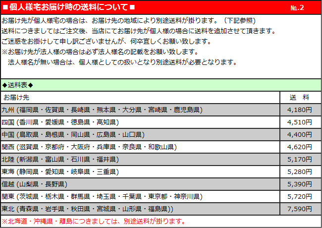 | (1).お届先が「北海道・沖縄・離島」(※商品によっては「東北」を含む)の場合は 別途送料が掛かります。 お届先の情報をもとに送料を設定させて頂きますので、お支払については 当店より送料のお知らせの後にお願い致します。 (2).一部商品については「個人様宅」へのお届の場合、別途送料が掛かる場合が ございます。 (3).送料のお問い合わせの際は、以下の情報をご連絡下さい。 ・お届け先の郵便番号 ・お届け先が「個人様宅」or「法人様」 |