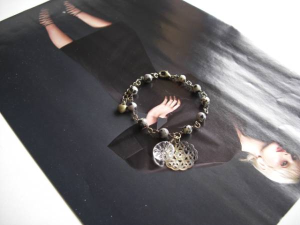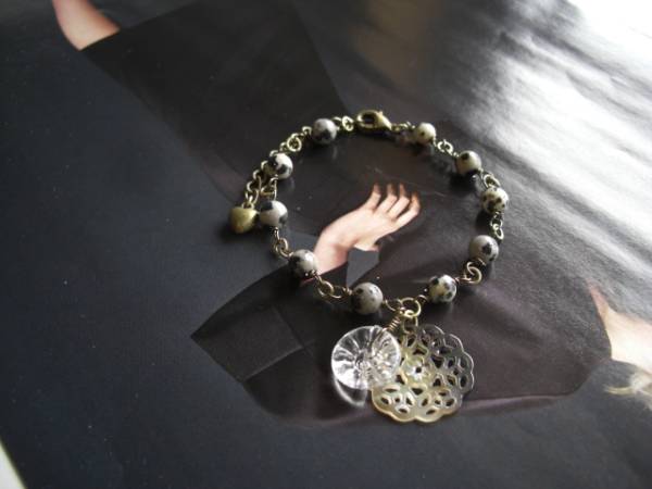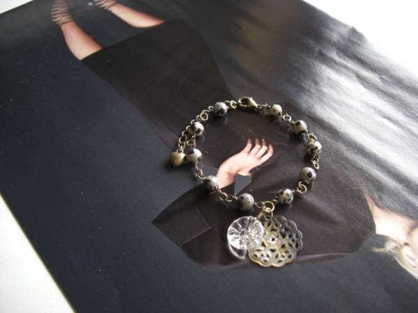早春の薔薇・・シリーズです♪シックなダルメシアンのブレスレットです♪透かし模様の黒蝶貝やアンティークボタンを合わせて大人のロマンチックしています♪6ミリの丸玉のダルメシアンジャスパーに22ミリ位のシェルや12ミリのアンティークボタンを合わせました♪長さは23センチ位で調節自由です♪お揃いのネックレスも出品しています♪シンプルで合わせやすいデザインを考えて作りました♪ハンドメイドをご理解いただいてノーリターン、ノークレームでお願いします♪