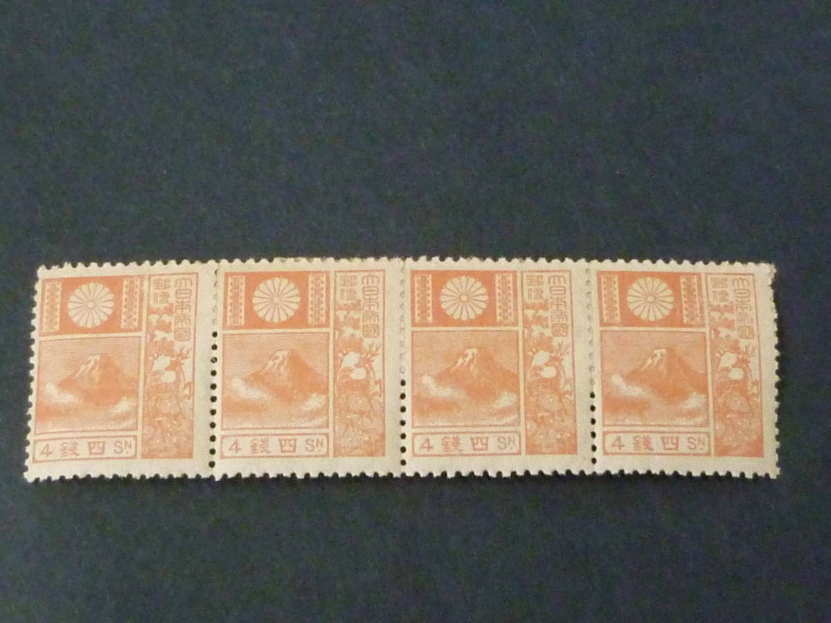 22 P №D 日本切手 1930年 #156 新版改色富士鹿 4銭 4枚連刷 未使用・裏面間紙付着有