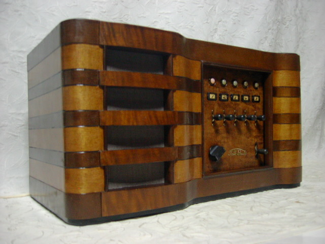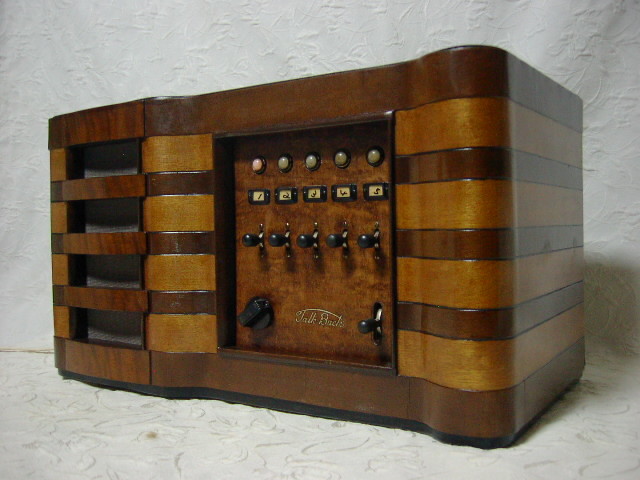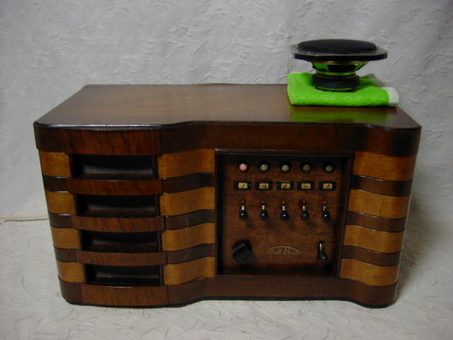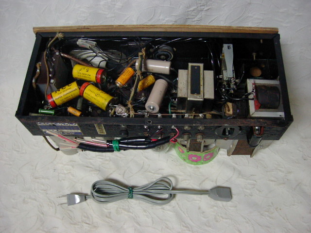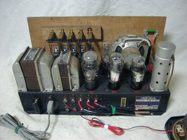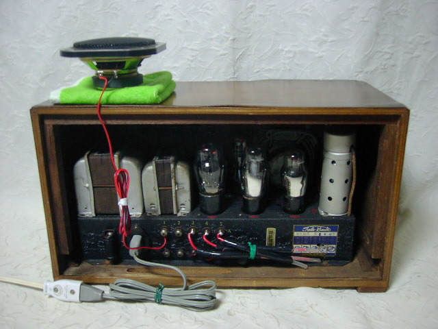 商品説明 ・・・      電気文化物 復元・整備済み 完動品 !! メーカー不明の希少 珍品・博物品なる「Talk Back」と書かれた 真空管式のビンテージな有線式インターホンシステムです。同系色のニス塗装により木目を生かした 外装程度の方は、裏蓋が欠品して 年代経過による多少なりの使用感は有りますが、スピーカークロス ( ) をリニューアル交換とし 各パーツが欠品ナシで状態の良い機器と成っています。又、本機は 稀に見る特殊機器 (「特許模造厳禁」と書かれています ) でしたので、目視点検・テスター点検で原理・構造を把握しながら タップリと時間を掛けて完動品と致しました。使用真空管は「UZ-57 / UY-56 / UY-47B ( 入手当初、内部がリークショートしていたので 手持ち品と交換 ) / KX-12F & KX-80」のオールドなST 合計5本と成っていて、スピーカーは入手当初、自励のみを取り出すフィールドコイル式 ( OPTはシャシー内部に有ります ) でしたが コイル切れの為 手持ちの同等サイズの「パーマネント式スピーカー」を取り付けし、又 取り外した線間に 2KΩ2W型抵抗器を取り付けて状態復帰と致しました。又、本機には メイン電源スイッチの設定は無く、取り合えずは コンセントを家庭用AC100Vに接続すると「UZ-57 / UY-56 / KX-12F のヒーターが点灯して常にスタンバイ状態」にしています。それで、各パーツの動作・操作方法に付いての説明ですが、本機の左側から「マイク兼用スピーカー ( 一般的なIMP 8Ωスピーカーですが、送話と受話が可能 ) /// 上部:各5ch毎の送話・受話パイロットランプ ( 特使なオリジナル品で、3chのランプが接触不良でしたが 全て現役で生きています / 各チャンネルのスピーカーをセッティングしないと 夫々のパイロットランプは点灯しない構造と成っていますが、今回、本機の1ch に子機用スピーカーをセットしていますので、1ch のパイロットランプが点灯しています ) 中部:2接点ホールディングスイッチ ( 5chの各子機用スピーカーとの通話スイッチ ) ( UP ) UY-47BKX-80 のヒーターが点灯して通話状態に成り パイロットランプが消灯します / ( DOWN ) UY-47BKX-80 のヒーターが消灯してスタンバイ状態と成り パイロットランプが点灯します・下部:左側に音量ボリューム、そして 3接点センターホールディングスイッチ・ ( UP ) 各子機のスピーカーへ呼び出しブザー ( ブー音 )( CENTER ) 各子機から親機スピーカーに受話状態・( DOWN ) 親機から各子機スピーカーに送話状態」とする構造と成っています。なお、その他のレストア作業に付いては「電源コードが欠品とされ、シャシー側コネクターが特殊なカプラーだったので、大き目な手持ちのインプットコンセント部をヤスリ掛けし形を整え製作し状態復帰 / シャシーリア部の子機スピーカー出力端子の「配線締め付けロックナットの6個が欠品」していたで、「+赤・-黒線」を端子にハンダ付け増線して状態復帰 / 等々」として完動品とした次第です。又、今回 5chのスピーカーラインに 手持ちとしていたオーディオ用IMP 8Ωスピーカーの一個をセットとし ( OPTはシャシー内部に有ります )、このスピーカーで 各ラインの全てをチェック&確認して完動品としていますが、他のチャンネルの8Ωラインスピーカーは落札者様サイドでセッティングとして下さい。又、本機スピーカーと子機スピーカーを近付けると「ハウリング」を起こしますのでご注意下さい。シャシー内外部もクリーニング済みとし ボリューム&各スイッチ系にガリ音ナシでの電気文化物 復元・整備済み完動品、メーカー不明の希少 珍品・博物品なる「Talk Back」と書かれた 真空管式のビンテージな有線式インターホンシステムは如何でしょうか ・・・。ちなみに大きさは 45cm / 全高25cm / 奥行 23,5cm、全重量 凡そ 9Kg と成っています。