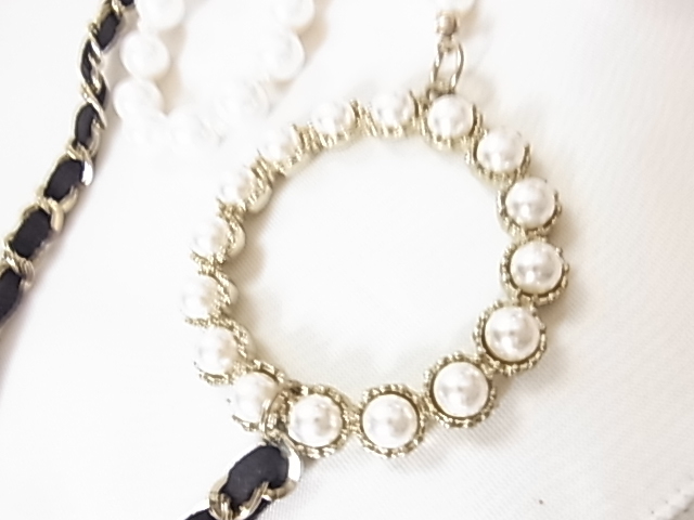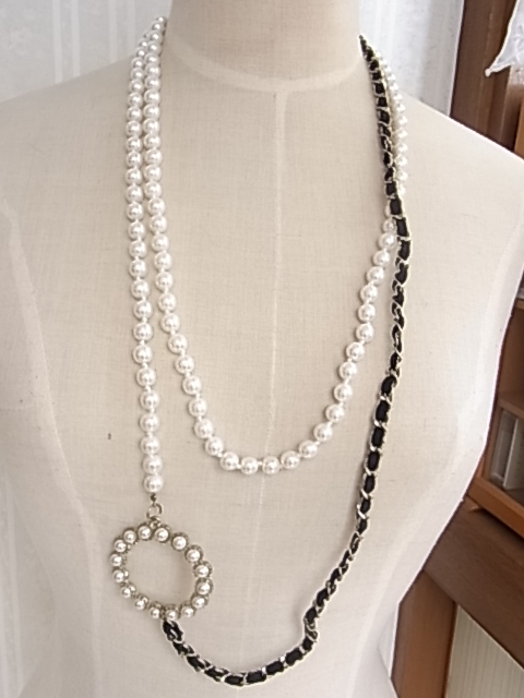 ●プラスチックパールと革紐調のコンビデザイン 2連でフープのアクセントも個性的 ネックレス