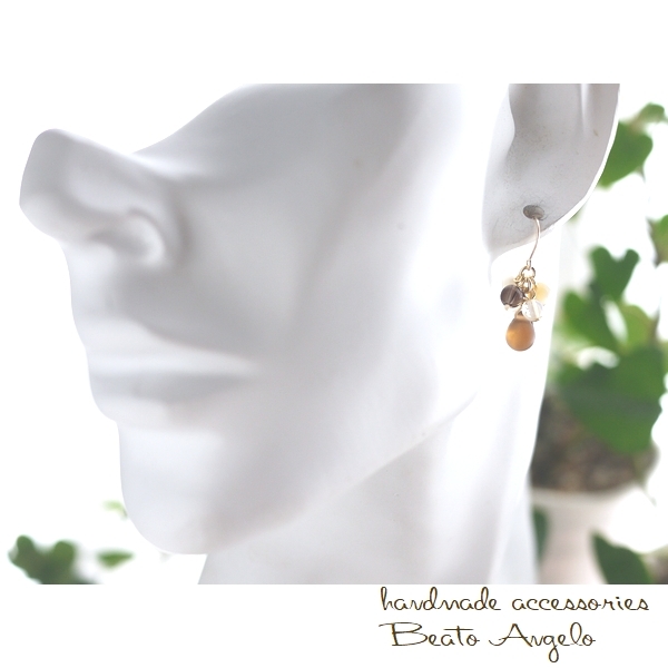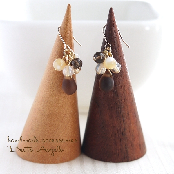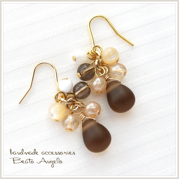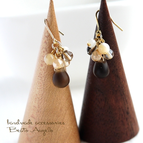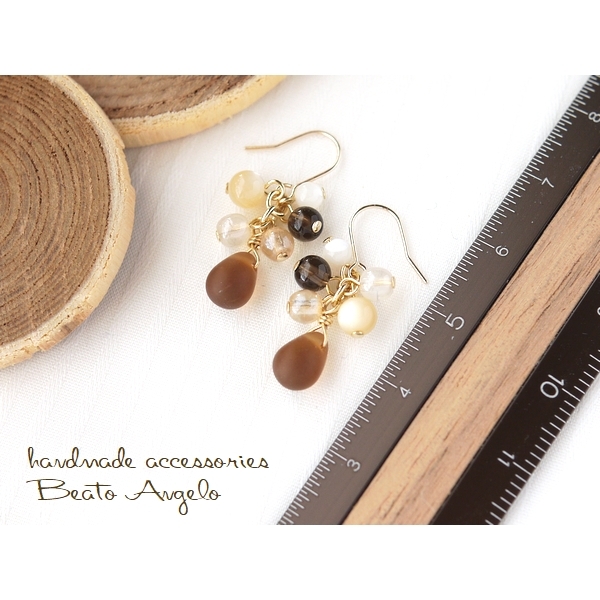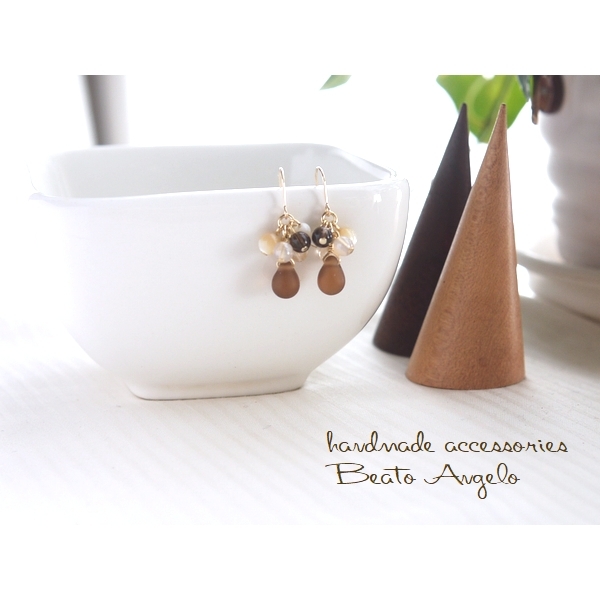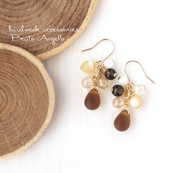 ◆+angelo+チェコドロップとマザーオブパールのピアス(p-322)スモーキートパーズ マット G d001 ブラウン 天然石 チタン 樹脂 イヤリング