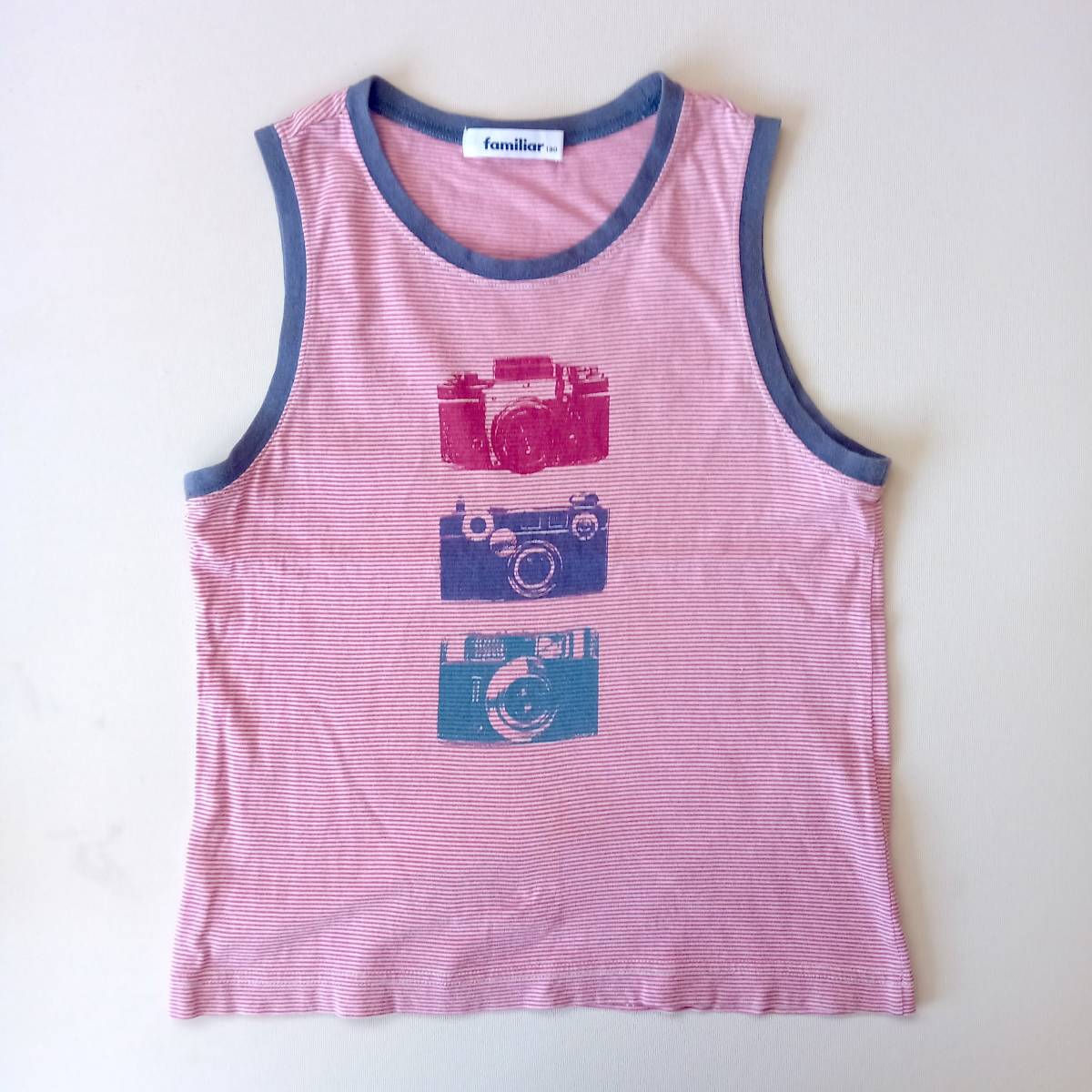 美品 ファミリア familiar タンクトップ 130 シルクスクリーンプリント カメラ