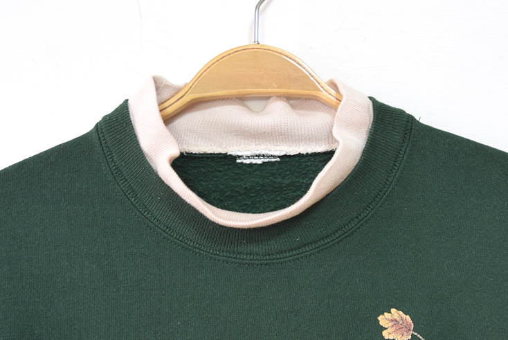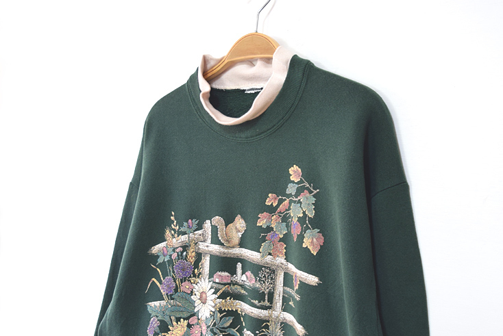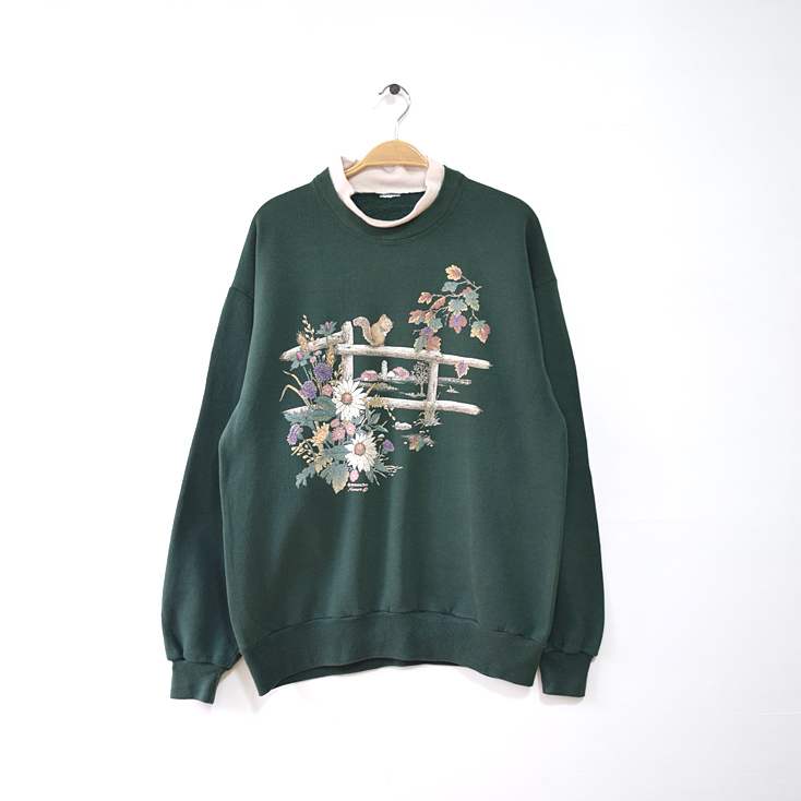 【送料無料】90S オールド ファニー プリント スウェット トレーナー リス レディースL相当 ヴィンテージ 深緑色 グリーン 古着 CF0132