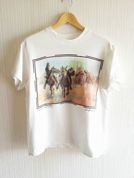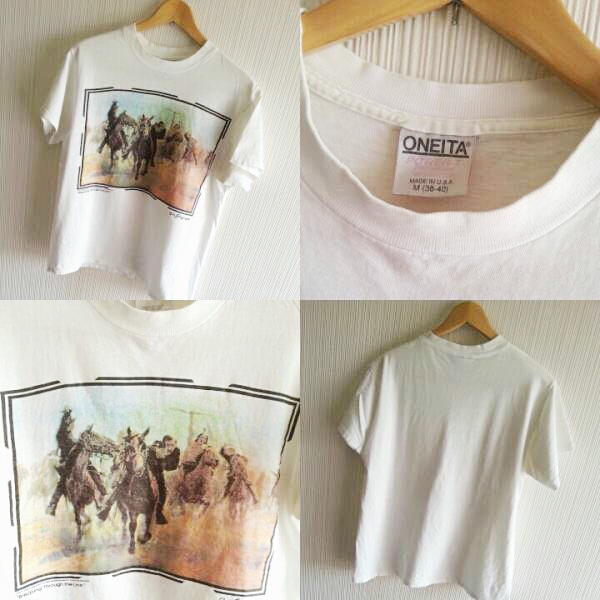 商品説明 | 商品に興味をもっていただき、ありがとうございます。 以下お読みいただき、入札をお待ちしています。 【商品の説明】 Chas Schreyvogel 1861-1912 (チャールズ シュライフォーゲル) 80s~ プリントTシャツ ビンテージ オリジナルになります。 フロントには名作,Breaking Through the Lineが大きくプリントされ、西部開拓,フロンティア等レトロでアンティーク感溢れる作品になっています。 ボディは初期のONEITAタグ付きのUSA製ビンテージ、何より彼の作品がプリントされたビンテージTシャツは全く出回っていないと思いますので、極めて珍しい激レアな一枚です。 アンティーク絵画,アート好きは勿論、アメリカやビンテージ好きにはたまらないコアなアイテムだと思いますので、お好きな方、是非この機会にいかがでしょうか。 今後まず見つからない大変希少な一枚です。 商品名 : 80s USA製 Breaking Through the Line ブランド・メーカー: Chas Schreyvogel ※初期ONEITAタグ サイズ:M 平置き実寸 肩幅ー44 身幅ー50.5 着丈ー60 ※多少の誤差はご了承下さい 素材: コットン 100% 【商品の状態】 使用状況 :ビンテージならではの使用感,薄汚れ,細かいスレ,ヤレ,首リブピンホールが数ヶ所ありますが、着用に支障のある大きなダメージ等は見受けられません。 ビンテージ慣れされている方であれば問題無い程度だと思います。 まだまだ十分着用していただけると思います。 | ||