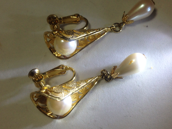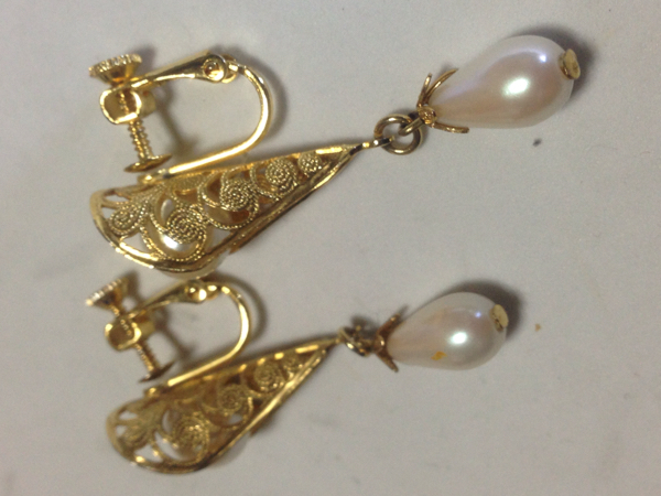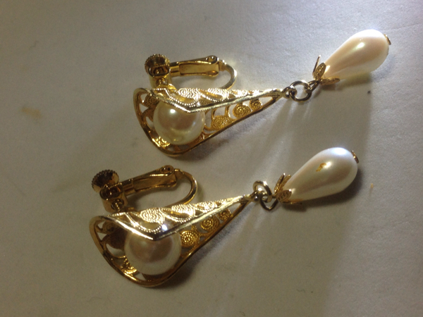フェイクパールの、透かし彫りデザインイヤリングです、サイズは45×15ミリ、様式はネジバネ式になっております