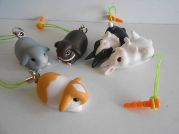 1.箱座り ホーランド・ロップ オパール 2.箱座り ホーランド・ロップ オレンジ 3.箱座り ホーランド・ロップ チョコレートオター 4.ごろ寝 ダッチ ブラック 5.ごろ寝 ネザーランド・ドワーフ ルビーアイドホワイト 6.おすわり ネザーランド・ドワーフ オレンジ 7.毛づくろい ネザーランド・ドワーフ チェスナット ◇かわいい仕草に癒されて おすわりと毛づくろいはボールチェーン! その他はイヤフォンプラグ付きストラップ |