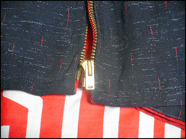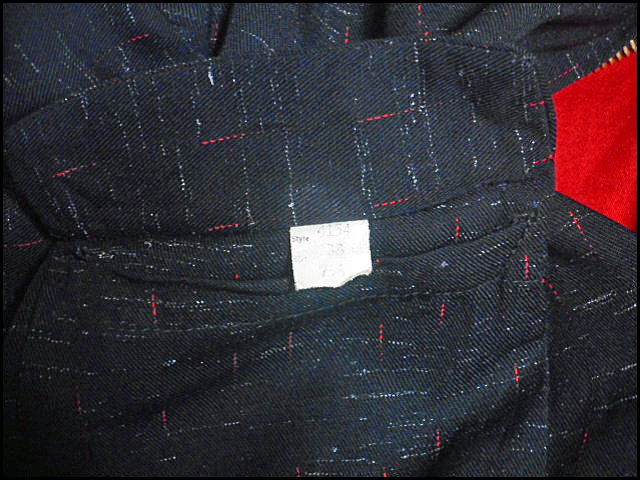 ボディーはウールとコットンが混じった様な表面に少しザラつきを感じる素材感、黒(ブラック)ボディーに赤と白の絣柄が全体的に入っており、フロントジッパーはLIGHTNING(ライトニング)ジップ、フラップポケットの内側に紙タグが残っております。