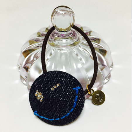 デニム生地にスタッズと刺繍糸でニコちゃんの顔を作りました。裏はフェルトを貼り付けています。