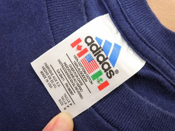●USA製アディダス、Tシャツです。あくまでも古着のため、ノークレームノーリターンでお願いいたします。使用感は、ございますが、穴などのダメージはございません。 素材はコットン100です。 色は紺色で、腹部に薄く色落ち箇所がございます。