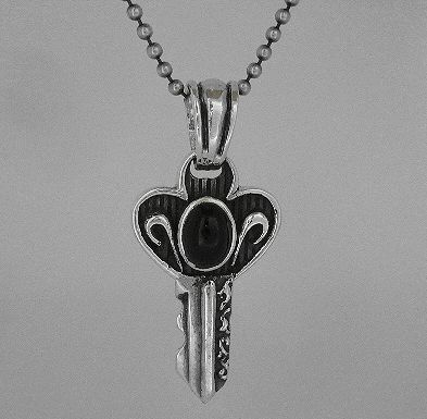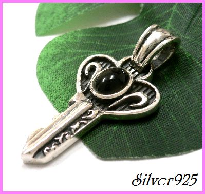 シルバー925銀の天然石オニキス付ハート キー鍵カギ ペンダント