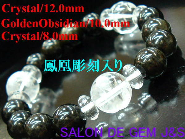 【鳳凰彫刻】【才能の開花・若返りの石】【高級ゴールデンオブシディアン/天然クリスタル 2025年風水・開運ブレスレット】12.0-8.0mm/15cm