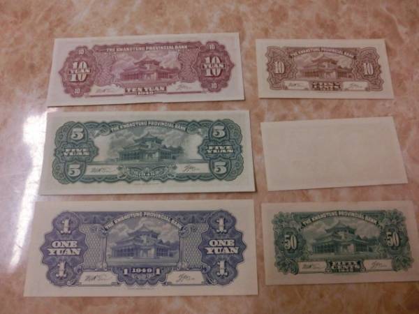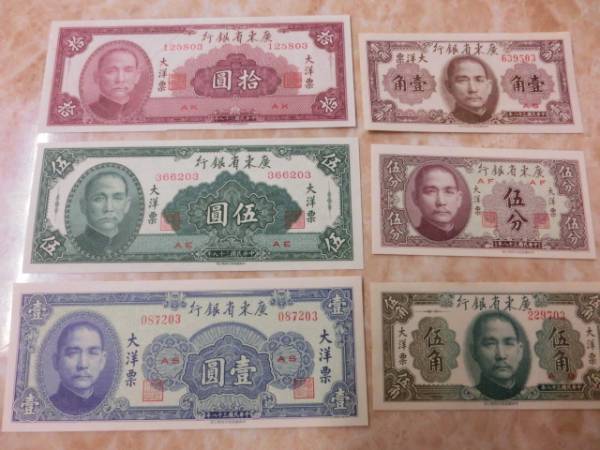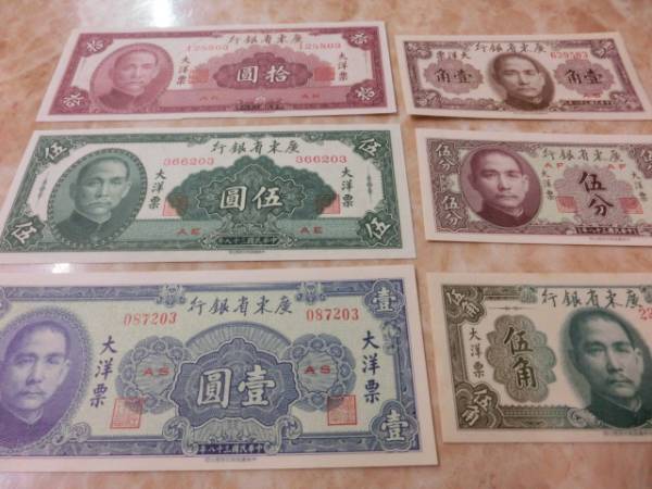 廣東省銀行の伍分・壹角・伍角・壹圓・伍圓・拾圓の6種6枚セットです。