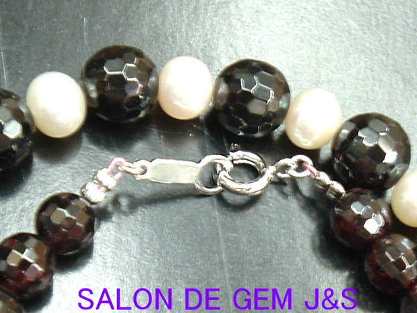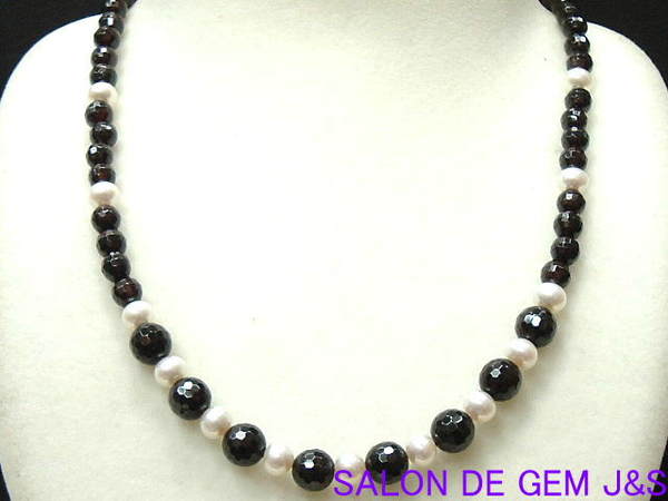 ●128面カットワインカラーの高級ガーネットと天然ホワイト系真珠光沢のパールが煌き、とても耀きのあるネックレスです。