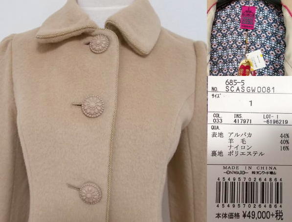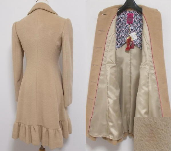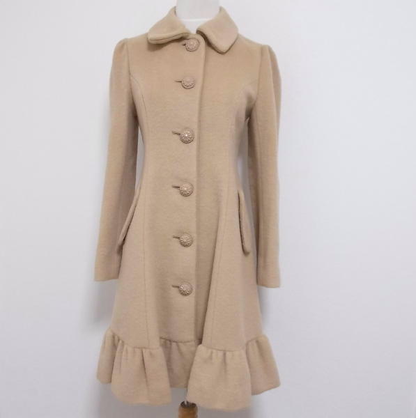 | ◆23区のアルパカシャギー コート新品です。 裾のフリルが可愛いウールコートです。着た時に裾がひらっと広がる美しいシルエット。上見頃はすっきりとさせて、大きく見えないようにこだわりました。前を閉めてドレスのように着ても、前を開けて着ても可愛いデザインです。 生地はイタリアの老舗メーカーであるビゼンティーノ社製のものを使っています。ラグジュアリーブランドとの取引で定評のあるメーカーの、着心地のいいアルパカ混の上質なウールを使用しました。スーリーアルパカを使用した非常に綺麗なシャギー感がこの素材の特徴となります。艶も非常に出ています。 目立つものではありませんが、左袖に赤っぽい汚れがあります。(3枚目右下画像参照して下さい)品質タグにカット有。ご理解の上、ご入札をお願い致します。 定価は¥52.920です。 表記サイズ 1 実寸サイズ 肩幅:35cm 身幅:42cm 着丈:89cm 袖丈:58cm ※すべて平置きにして採寸しております。 素人採寸につき誤差が生じますのでご理解下さい。 カラー ベージュ系 素材 アルパカ:44% 羊毛:40% ナイロン:16% |