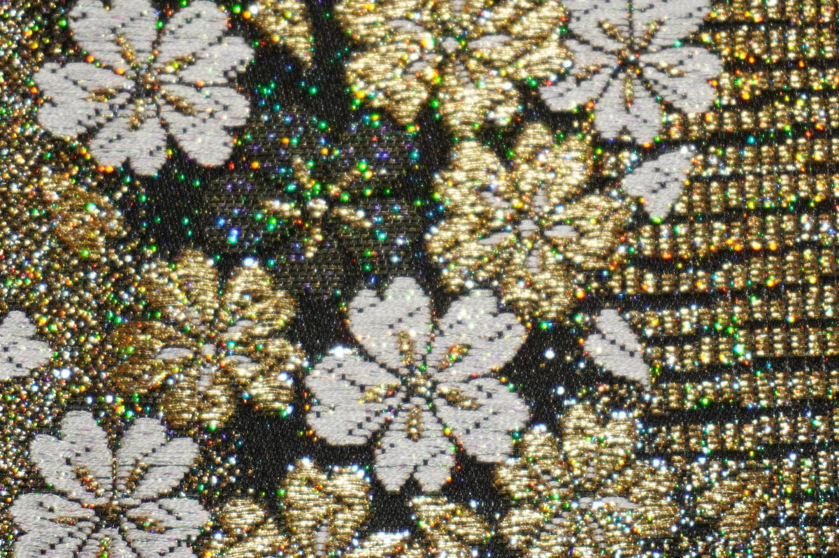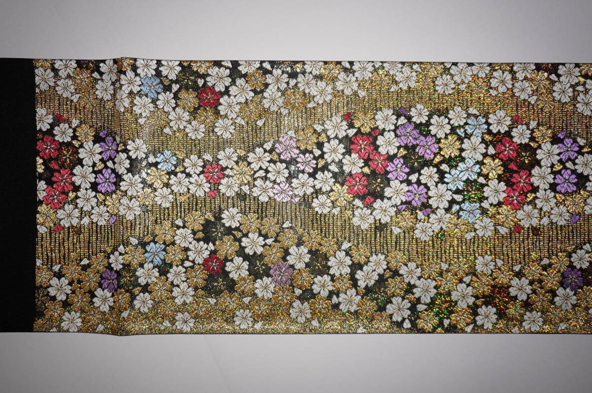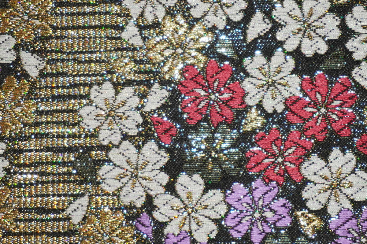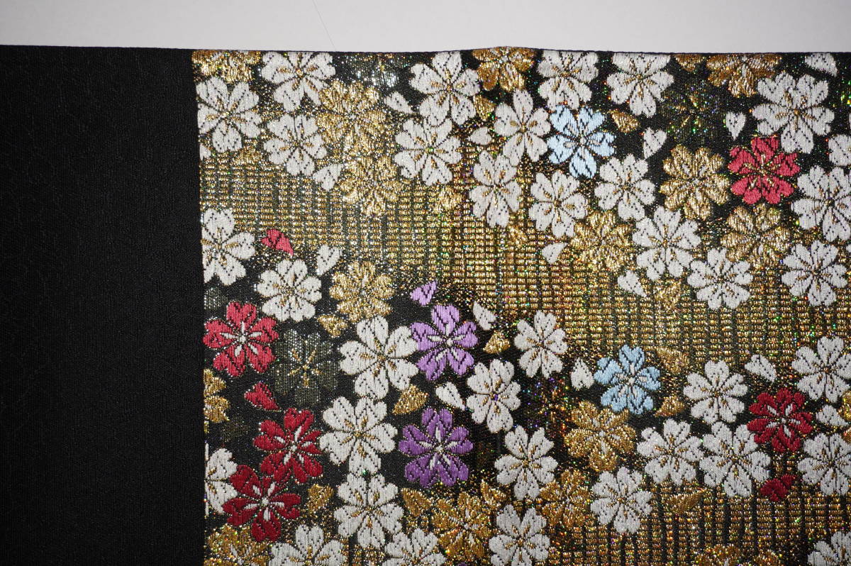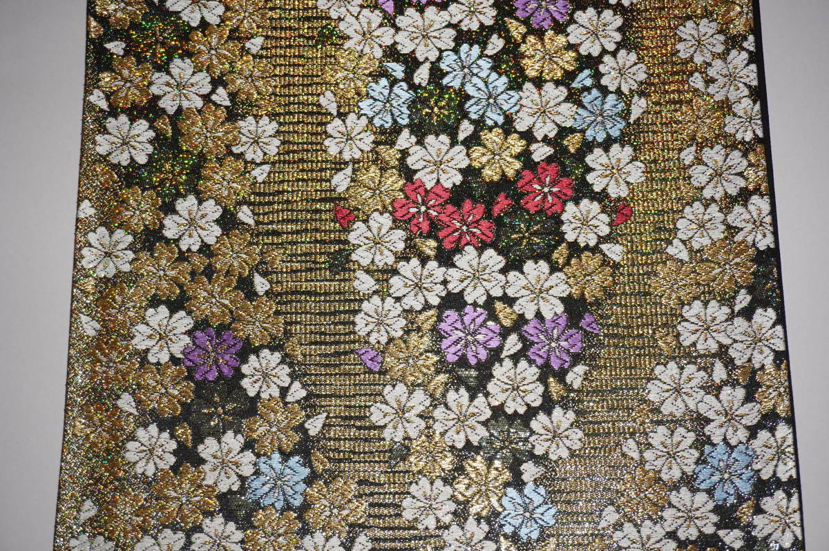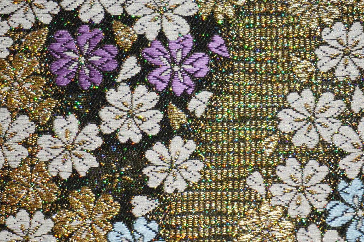 なお、帯柄左上に無地で出ているところは裏無地で、柄と柄の間に出ているところは手先と前太鼓のあいだの無地部分です。六通柄です。金銀糸が多用されているためストロボの照りで、しろぽく写っている部分があります。