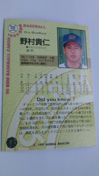 元MLB野村貴仁!オリックスブルーウェーブ元巨人日本ハムファイターズ1995BBM98 |
