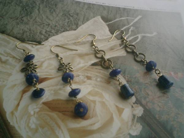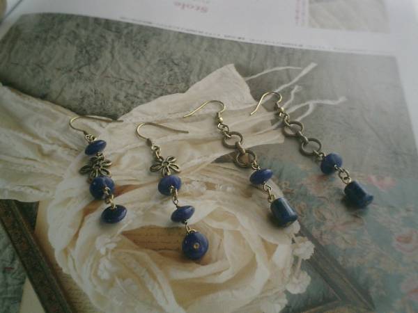 ロマンチック見本帳・・シリーズです♪神秘的な濃紺の・・ラピスのピアス4本セットです♪ペアが1組とデザイン違いが2本で合わせて4本セットです♪ラピスは8×6ミリ位のチューブと8ミリのディスクです♪デザインチェーンを合わせてキュートな表情です♪長さはペアが7センチ、デザイン違いが6.5センチ位です♪イヤリングにも変更出来ます♪♪お揃いのネックレスやブレスレットも出品しています♪シンプルで飽きのこないいつまでも着けられるデザインを考えて作りました!ハンドメイドをご理解頂いてノークレーム、ノーリターンでお願いします