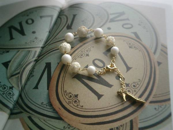 女の子チック・・シリーズです♪マットなホワイト・ベージュのブレスレットです♪マットな樹脂パールの8ミリ、10ミリの丸玉には樹脂薔薇や透かしボーンを合わせました♪長さは全長22センチ位で調節自由です♪♪マットなオフホワイトがアンティークな表情です♪♪お揃いのブレスレットやネックレスも出品しています♪シンプルで飽きのこないいつまでも着けられるデザインを考えて作りました!ハンドメイドをご理解頂いてノークレーム、ノーリターンでお願いします