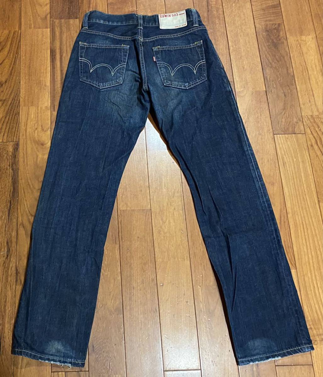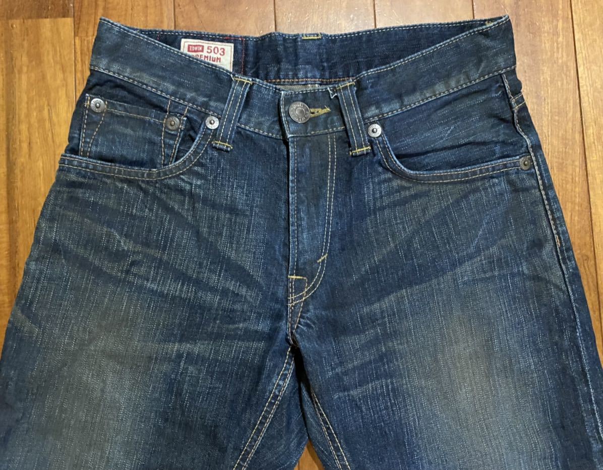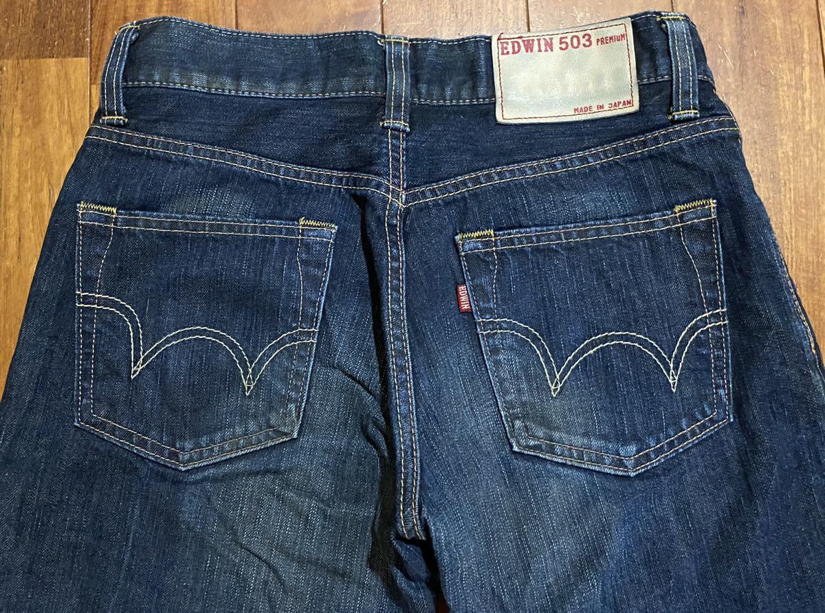 エドウィンのデニム(ジーンズ)、503E2 PREMIUMです。色はインディゴブルーです。USEDですが状態は良いです(10段階中8程度)。生地は綿100%です。牛革パッチ、ジッパーフライ、裾はチェーンステッチです。正規品です((株)エドウイン商事、日本製)。サイズはW28でウエストは重ねずに平置きで約73cm、ヒップ約96cm、股上約23cm、股下約76cm、股下15cmのふともも部分約51cm、裾まわり約40cm、重量約530gです。発送はゆうパケットポストになります。