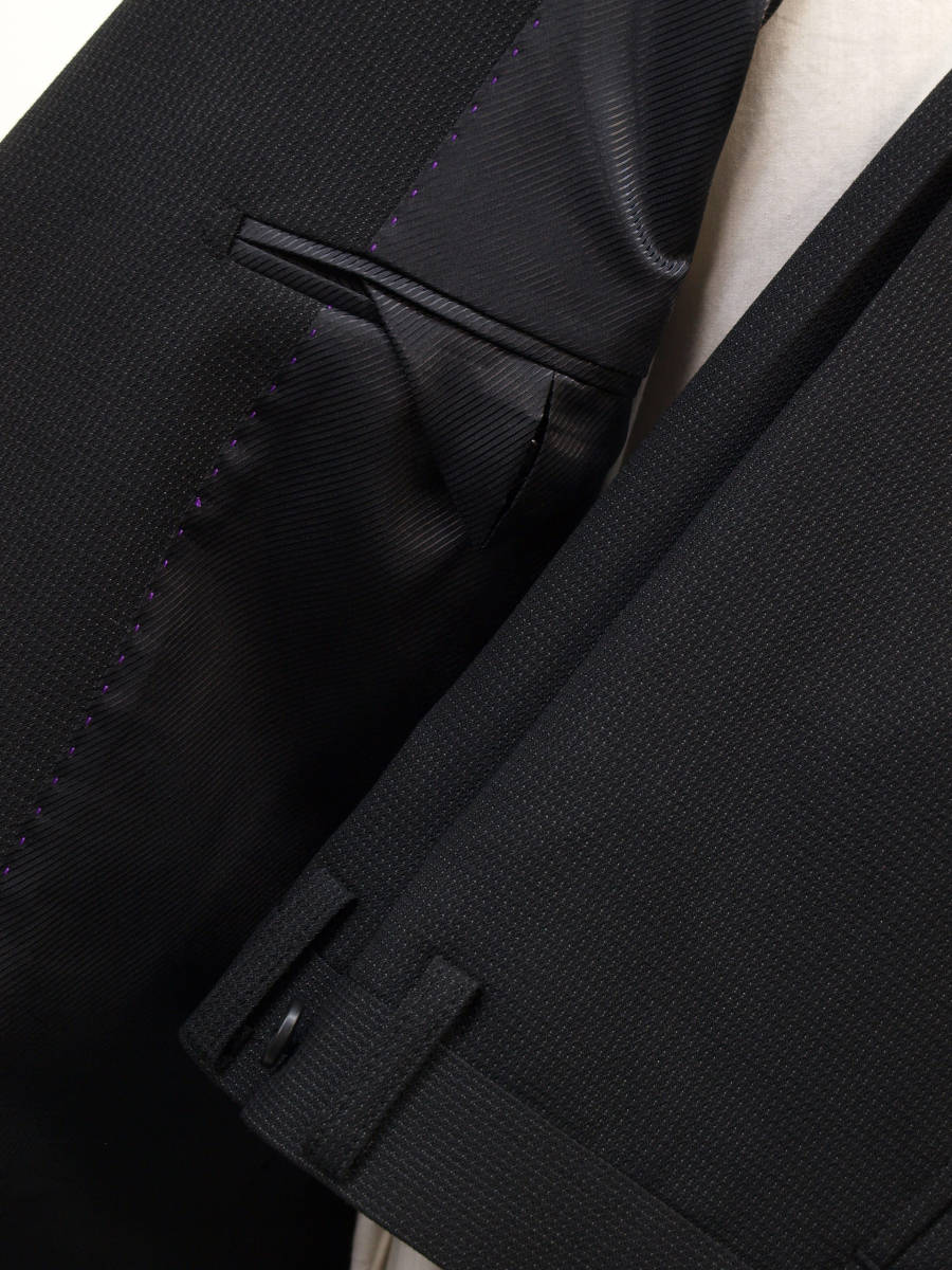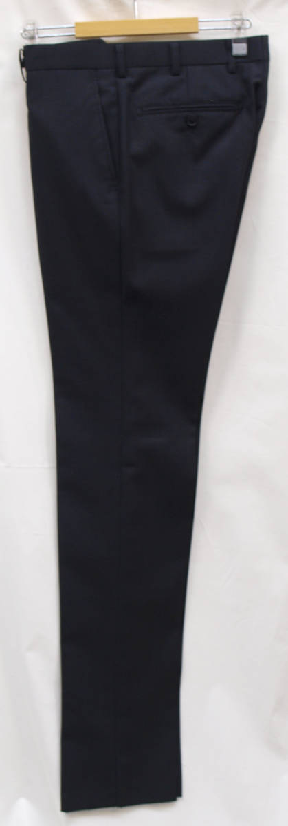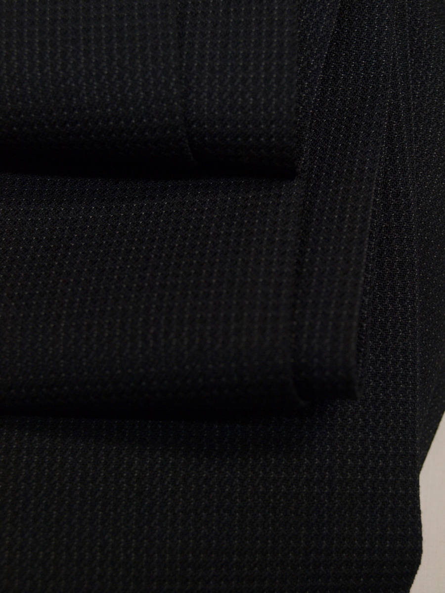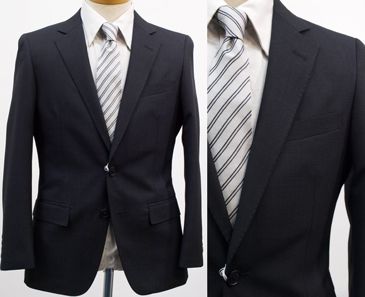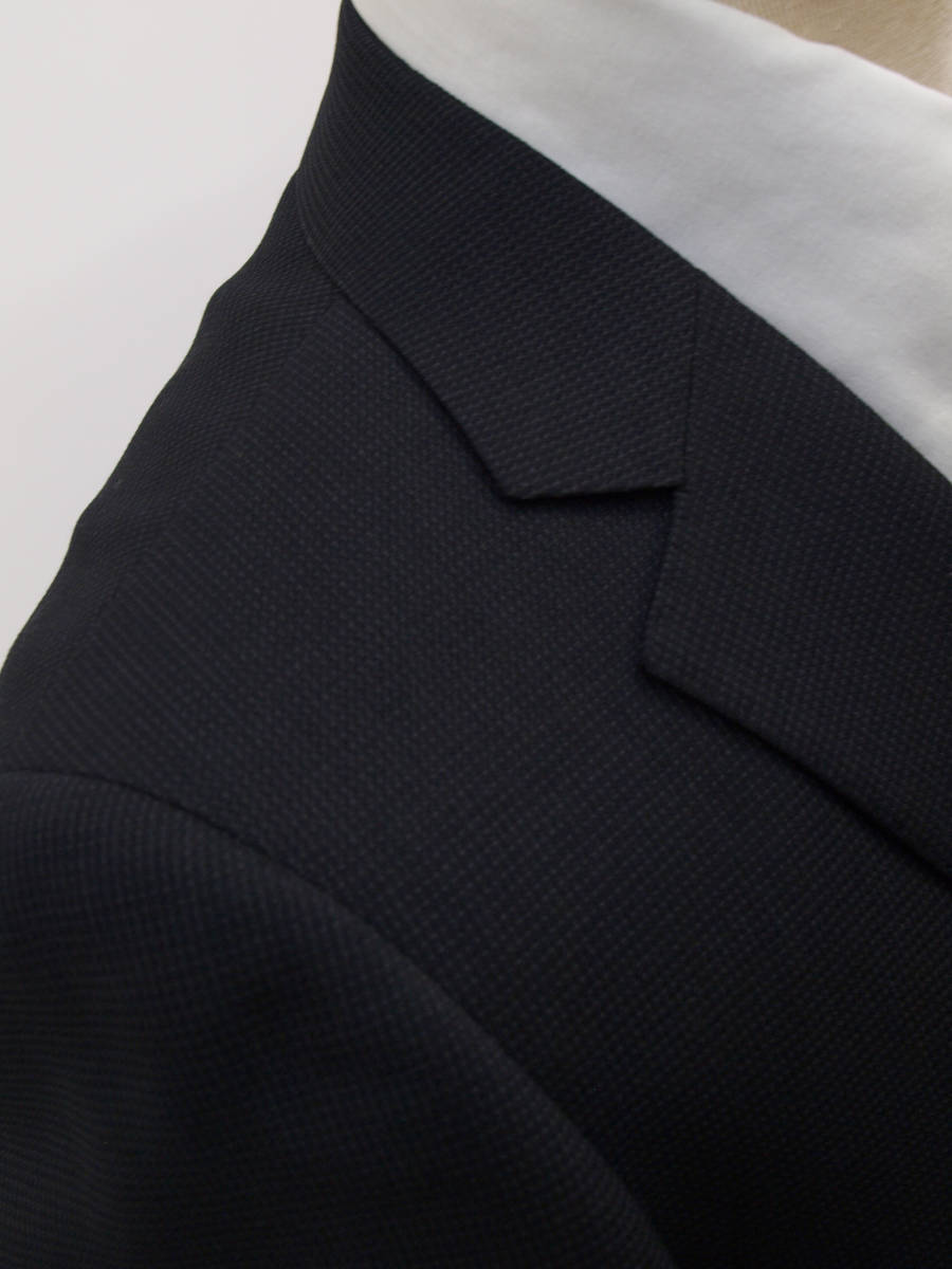 【サイズ】 AB5 (ABM サイズ相当) 目安の体型 身長165cm~175cm、ウエストサイズ86cm前後 【ジャケット実寸】 肩幅45cm 着丈69cm 袖丈60cm 脇下部分52cm 身幅46cm 【パンツ実寸】 ウエスト(胴回り実寸)86cm (平置きでかるくはかると86cmでひっぱってはかると89cmです。股上が浅いため2~3cmほど実寸が大きくなります。) わたり幅32cm(股下10cmの部位で28.5cm) 裾幅19cm 脇股上23cm 前股上26cm 股下89cm(裾上げしていない状態/新品) 【素材】 表地:ウール30% ポリエステル70% 裏地:胴裏/ポリエステル100% 袖裏/ポリエステル100% 秋冬スーツの中ではあまり厚手ではない秋冬向け紳士スーツ用ウールブレンド素材です。 【色】 黒色地 【柄】 グレーでこまかいピンヘッドストライプ織柄 【デザイン】 コンパクトな印象の細身ですっきりとしたシルエット、タイトフィットスリムスーツ新品、裾上げしていない状態です。 ジャケット:肩パットがはいっておらず軽い着心地のシングル2つボタン、細いシルエットのスリムモデル パンツ:股上は浅く細身シルエットのノータックスリムテーパードパンツ 秋冬商材ですが、それほど厚手ではない素材でご着用の地域にもよりますが夏を除くほぼオールシーズン対応商品です。 【縫製仕様】 ・ジャケットはシングル2つボタン、ノッチドラペル、襟縁等AMFステッチ入り、袖口ボタン4つ、センターベント、内ポケット4つ(小ポケット2つ含む)、総裏(秋冬春物) ・パンツはノータック、膝裏当て付き、脇ポケット斜め付け、後ろポケット両玉縁で左のみボタン付き、フロントはファスナーでボタン&ホック仕様/うちかけボタンあり、 細部にわたりきちんとしたビジネス仕様のきれいな縫製仕立てで仕上がっております。