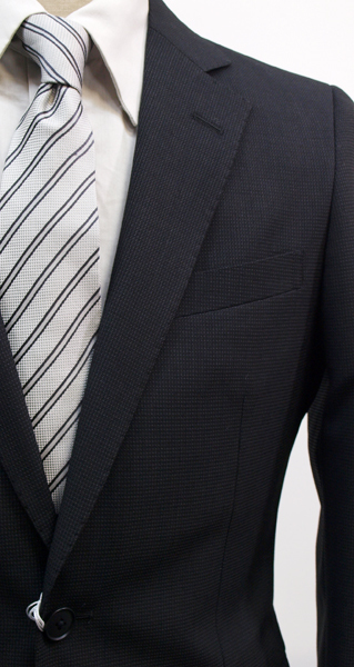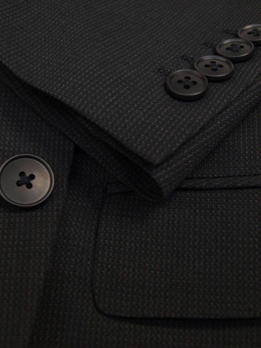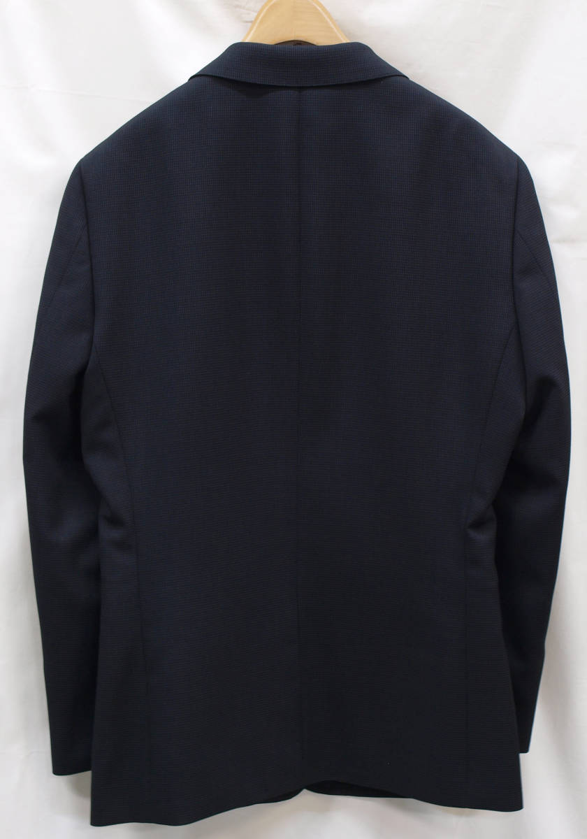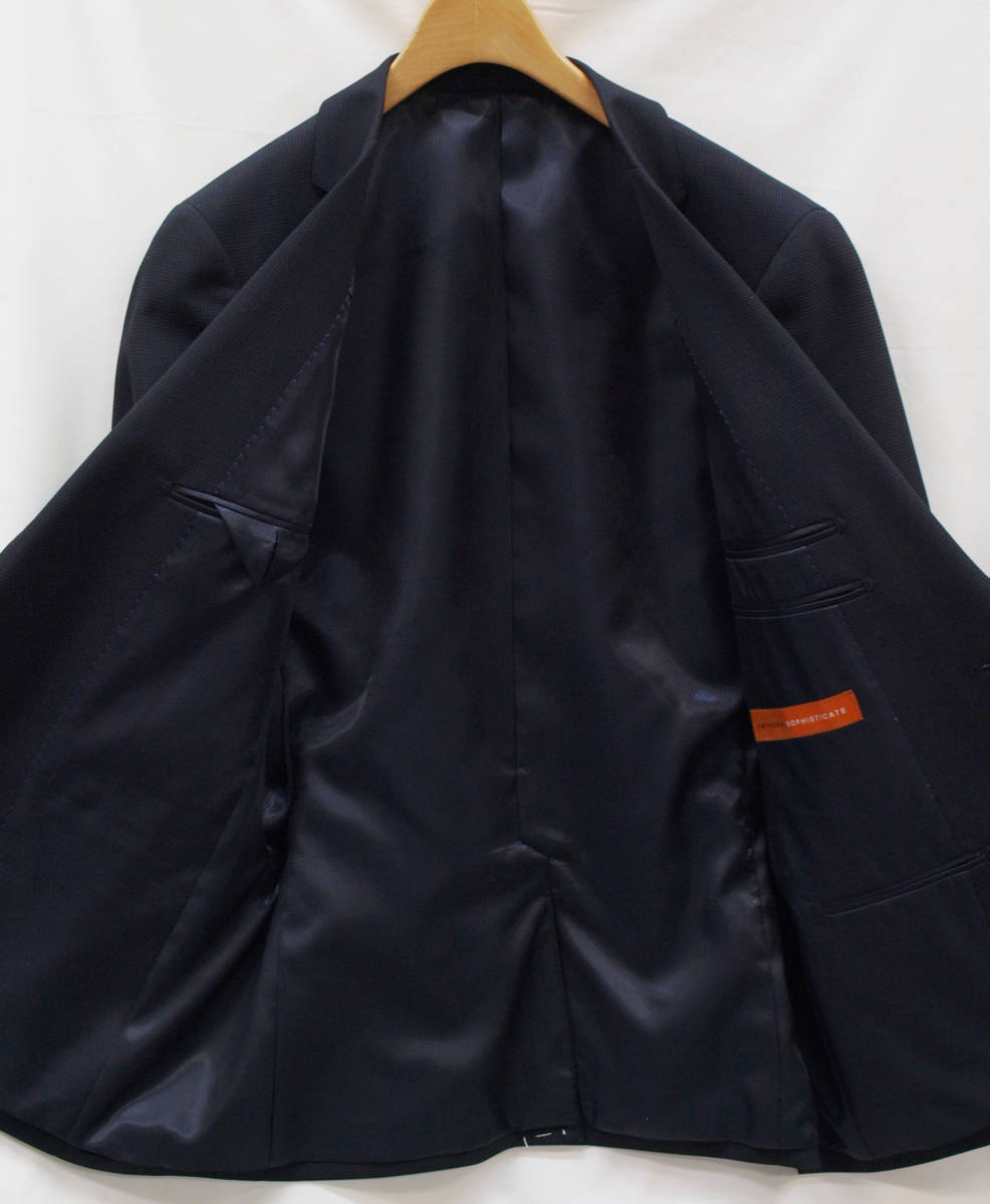 【サイズ】 AB5 (ABM サイズ相当) 目安の体型 身長165cm~175cm、ウエストサイズ86cm前後 【ジャケット実寸】 肩幅45cm 着丈69cm 袖丈60cm 脇下部分52cm 身幅46cm 【パンツ実寸】 ウエスト(胴回り実寸)86cm (平置きでかるくはかると86cmでひっぱってはかると89cmです。股上が浅いため2~3cmほど実寸が大きくなります。) わたり幅32cm(股下10cmの部位で28.5cm) 裾幅19cm 脇股上23cm 前股上26cm 股下89cm(裾上げしていない状態/新品) 【素材】 表地:ウール30% ポリエステル70% 裏地:胴裏/ポリエステル100% 袖裏/ポリエステル100% 秋冬スーツの中ではあまり厚手ではない秋冬向け紳士スーツ用ウールブレンド素材です。 【色】 黒色地 【柄】 グレーでこまかいピンヘッドストライプ織柄 【デザイン】 コンパクトな印象の細身ですっきりとしたシルエット、タイトフィットスリムスーツ新品、裾上げしていない状態です。 ジャケット:肩パットがはいっておらず軽い着心地のシングル2つボタン、細いシルエットのスリムモデル パンツ:股上は浅く細身シルエットのノータックスリムテーパードパンツ 秋冬商材ですが、それほど厚手ではない素材でご着用の地域にもよりますが夏を除くほぼオールシーズン対応商品です。 【縫製仕様】 ・ジャケットはシングル2つボタン、ノッチドラペル、襟縁等AMFステッチ入り、袖口ボタン4つ、センターベント、内ポケット4つ(小ポケット2つ含む)、総裏(秋冬春物) ・パンツはノータック、膝裏当て付き、脇ポケット斜め付け、後ろポケット両玉縁で左のみボタン付き、フロントはファスナーでボタン&ホック仕様/うちかけボタンあり、 細部にわたりきちんとしたビジネス仕様のきれいな縫製仕立てで仕上がっております。