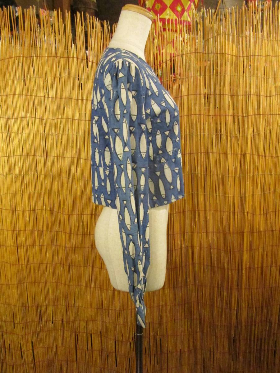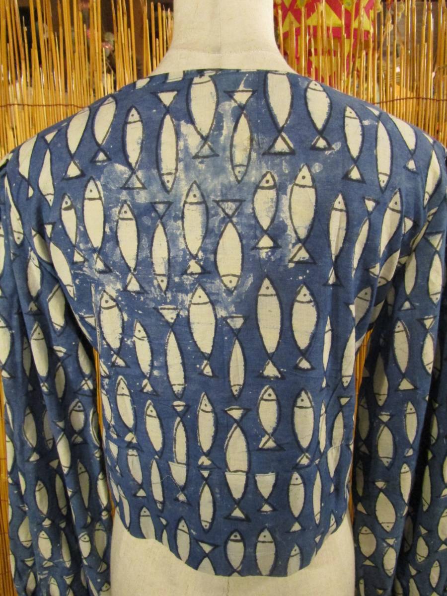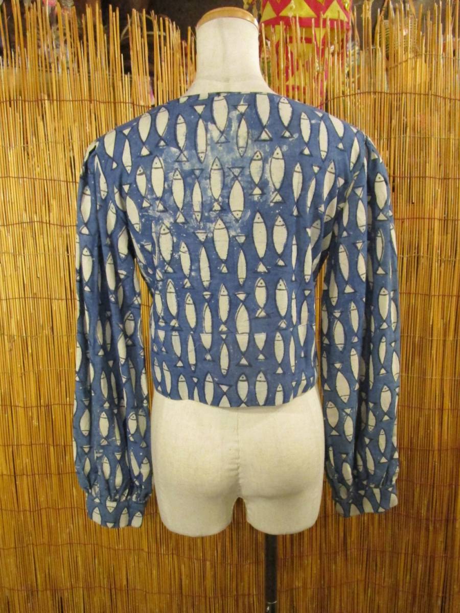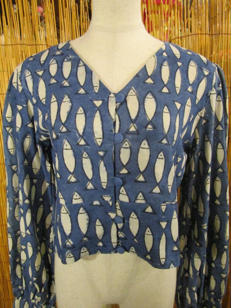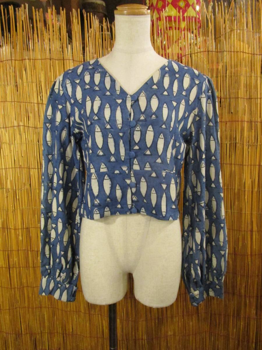 ①新品*藍染め*コットン素材*ハンドペイント*お魚*ショート丈シャツ