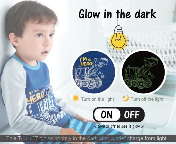 このパジャマは、光に当てると暗闇で明るくキャラクターが光ります!