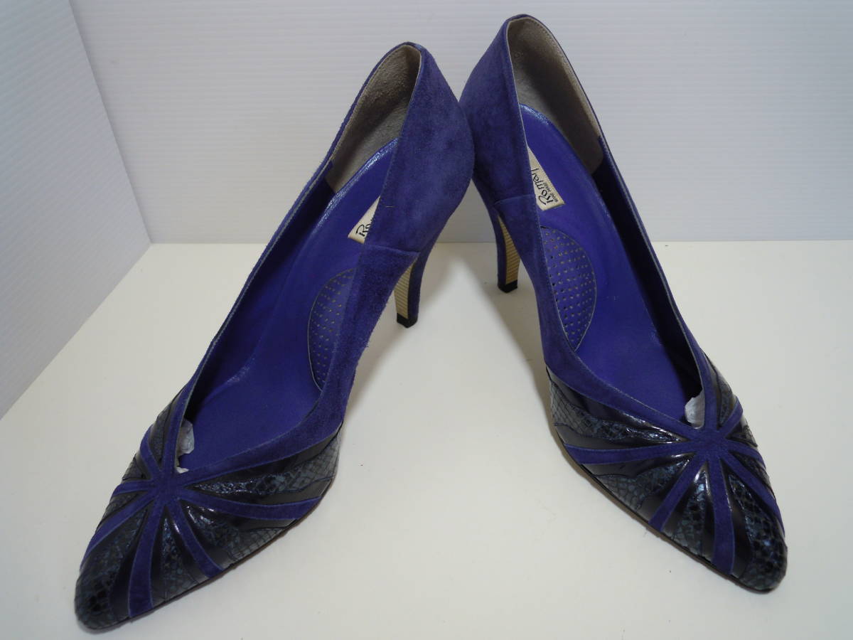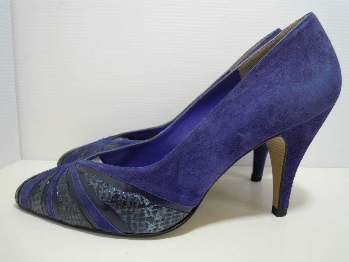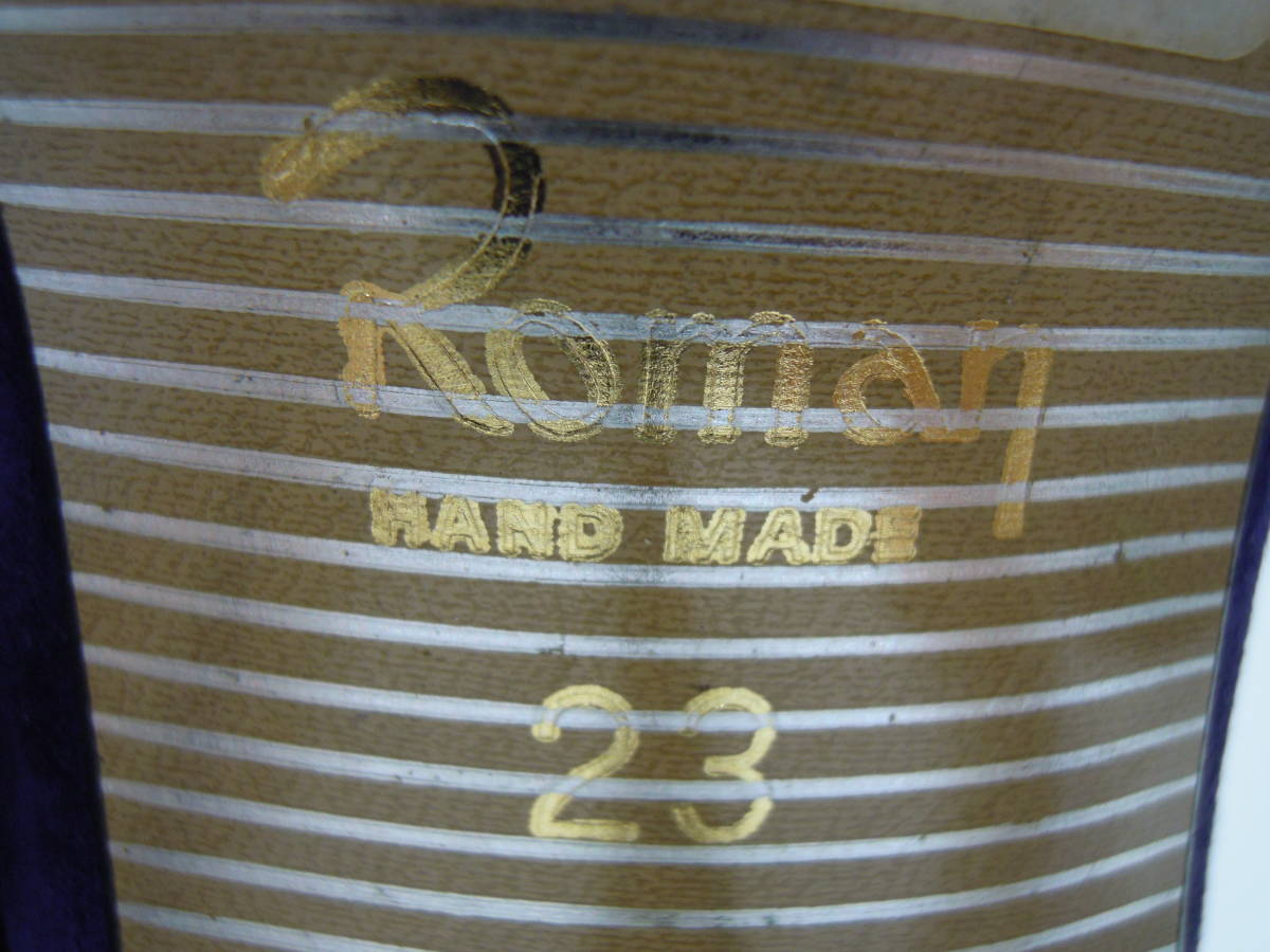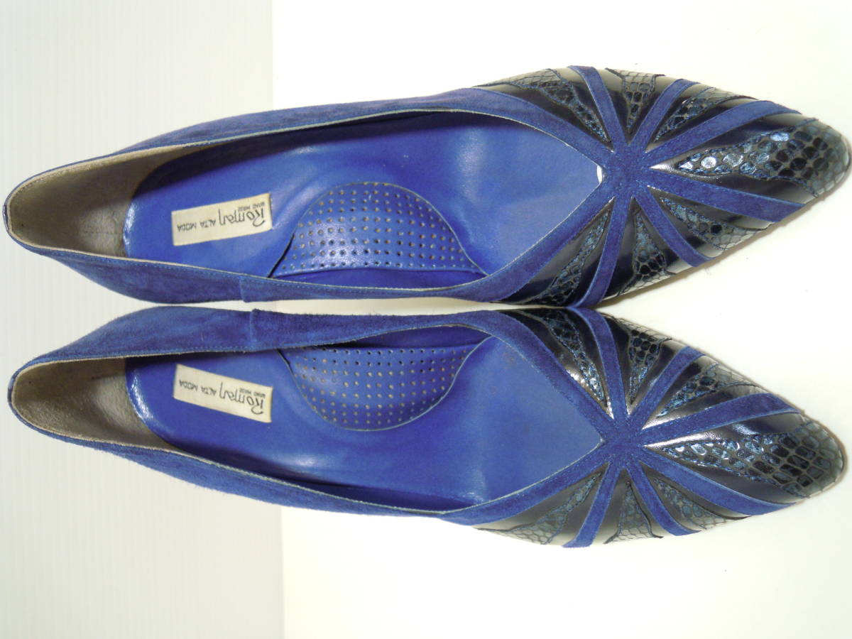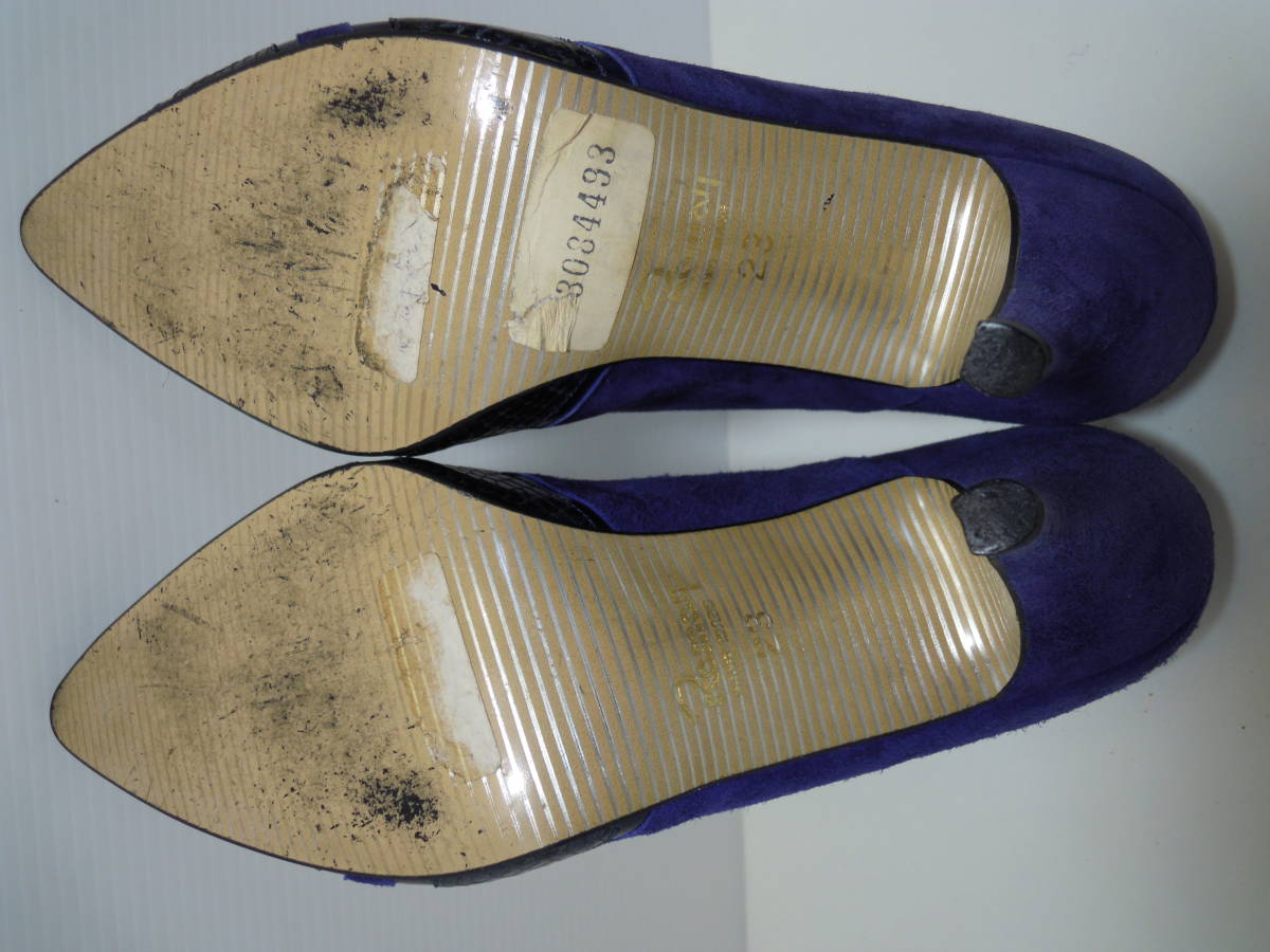 【ブランド・形態】 Roman ALTA MODA 本革スエード デザインポインテッドトゥパンプス サイズ23.0cmです。 【カラー】 ネイビー系です。 掲載の実物写真はPC環境や光の加減により実物と色合いが若干異なる場合があります。 【特徴】 上質なスエードレザーに、スネーク柄レザー・スムースレザーでデザインが施されたポインテッドトゥパンプス。 ヒールがあるのでパンツにもスカートにもカッコ良く決まります。 普段使いから御呼ばれやパーティースタイルにもぴったりの、ドレッシーな一足です。 ヒール高さ:約8.5cm、最大幅:7.5cm 【状態】 少々使用感はございますが、特に目立つダメージは見受けられず、使用に問題無いと思われます。 アッパーは比較的にきれいです。 トップリフトはすり減りがあります。 保管箱はありません。 【材質】 アッパー表:本皮革 アウトソール:合成底 【サイズ】 23.0cm、 質量330g #ロマン アルタモダ #Roman ALTA MODA | |||