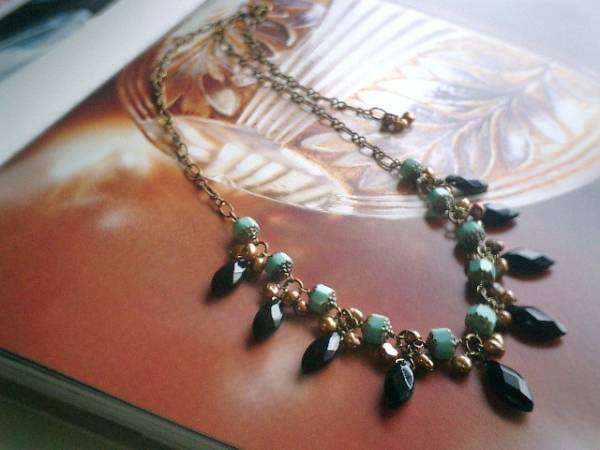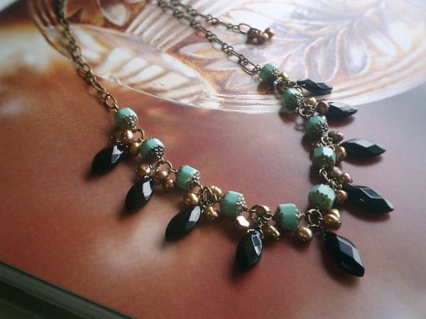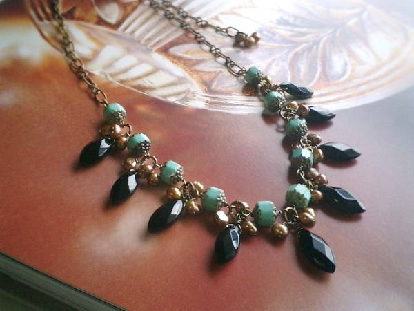 可憐なシルエット・・シリーズです♪オニキスに恋して・・シックなオニキスと淡水パールのモードなネックレスです♪カットが美しいマーキスカットのオニキスは8×16ミリ位です♪5ミリ位のブロンズ色のポテトの淡水パールとターコイズ色のデザインチェコを合わせてアンティークモダンな表情です♪秋のお洋服に合わせて楽しんでいただけます♪長さは全長65センチ位で調節自由です♪チョーカー風に着けられても素敵です♪お揃いのブレスレットやピアスも出品しています♪シンプルで飽きのこないいつまでも着けられるデザインを考えて作りました!ハンドメイドをご理解頂いてノークレーム、ノーリターンでお願いします