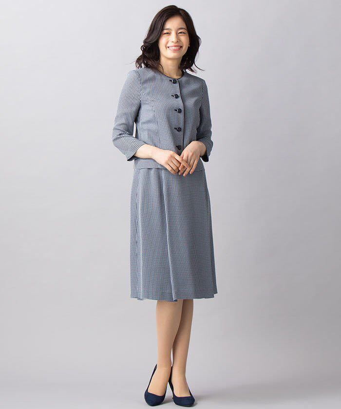 ジャカードで描き出した細やかなチェック柄がクラシカルな雰囲気を漂わす、ノーカラージャケットとフレアスカートのスーツ。シックな色使いに気品が香るアイテムは、セレモニーなどのオケージョンにもマッチ。