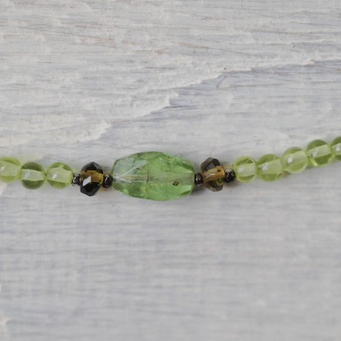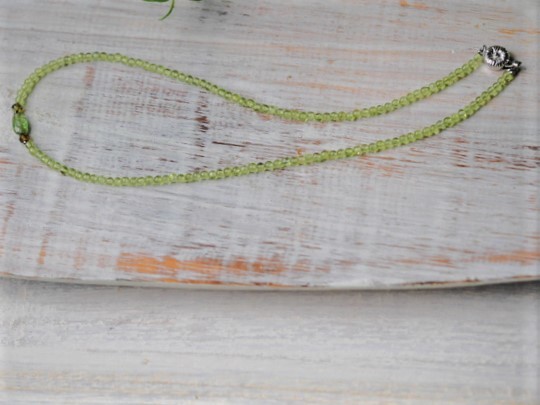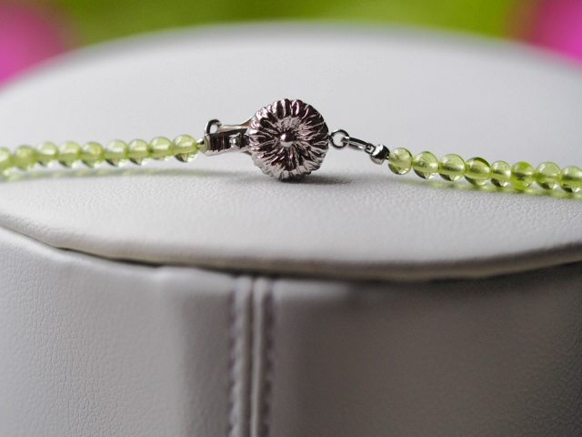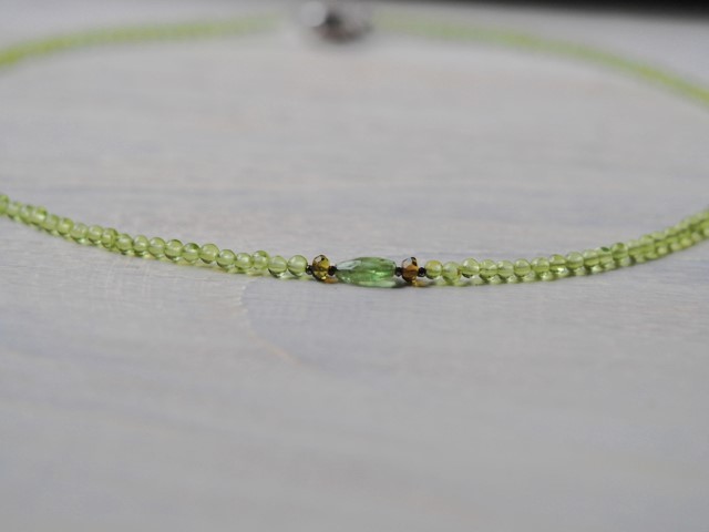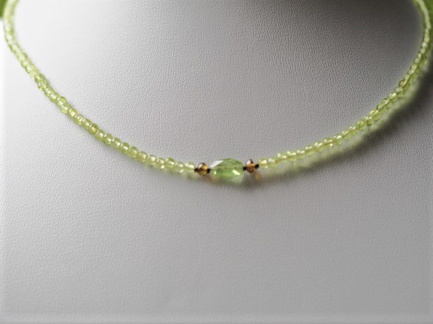 | (特徴など) | 小粒ながらも、 爽やかなグリーンカラー の ペリドット 3種類の石を使用して、 38cm短め(女性らしさにプラス☆) 涼しげなネックレスに施しました。 夏の季節 存分にお楽しみいただけます。 |